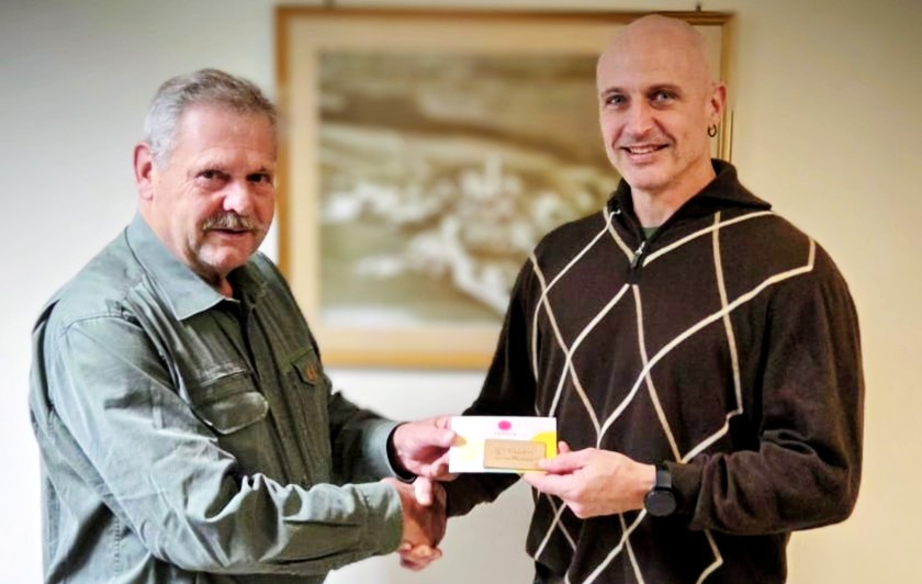 Rechtmehrings Bürgermeister Sebastian Linner (links) überreichte Andreas Gumminger jetzt einen Gutschein von Fichters Kulturladen für einen schönen Abend und bedankte sich damit herzlich im Namen aller Vereine am Ort.
