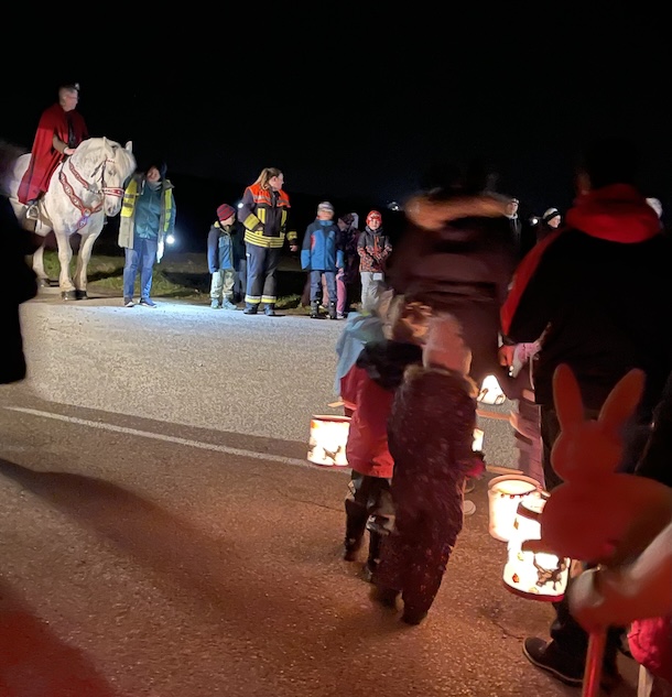 Voller Vorfreude hatten sich die Kindergartenkinder zuvor im Garten des Kindergartens mit ihren Erzieherinnen versammelt. Gegen 18 Uhr zogen die kleinen LaternenträgerInnen dann singend los – wie bereits im vergangenen Jahr um das angrenzende Schulgebäude herum und die eigens für die Veranstaltung abgesperrte Schmiedsteige hinunter. Dabei wurden die Kinder und Ihre ErzieherInnen auch in diesem Jahr von St. Martin auf einem weißen Ross angeführt. Die Eltern und Angehörigen, die vom Wegesrand in die strahlenden Gesichter der Kinder schauten, schlossen sich der Gruppe an und so ging man gemeinsam das letzte Stück bis zum großen Martinsfeuer.