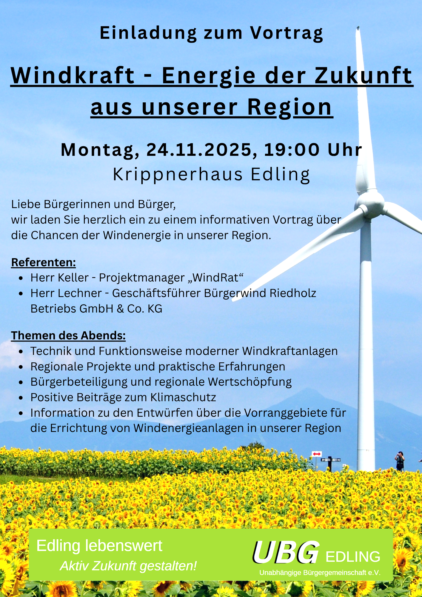 Die Unabhängige Bürgergemeinschaft Edling (UBG) lädt alle Bürger herzlich zu einem Vortrag über die „Chancen der Windenergie in der Region“ ein. Der Abend steht unter dem Motto „Windkraft – Energie der Zukunft aus unserer Region“ und findet am kommenden Montag, 24. November, um 19 Uhr im Krippnerhaus Edling statt.