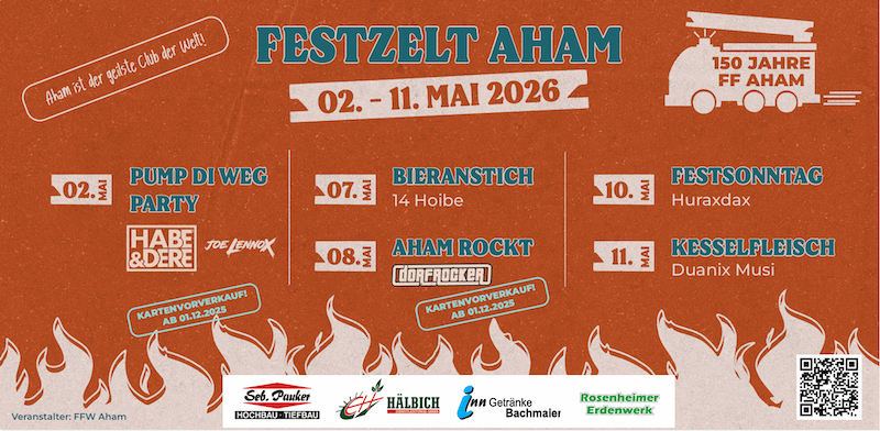 Am Freitag, 8. Mai, heißt es dann „Aham rockt“ – die Dorfrocker bringen mit ihrem rockigen Party-Schlager-Sound Schwung in das Festzelt. Auch hier startet der Vorverkauf für Tickets online und an den Vorverkaufsstellen am 1. Dezember.