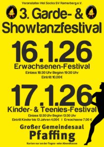 Auch 2026 veranstaltet die Showtanzgruppe wieder ein Showtanzfestival im Gemeindesaal in Pfaffing. Dieses Jahr wird es, neu, sogar ein Kinder- und Jugendfestival am darauffolgenden Tag geben.