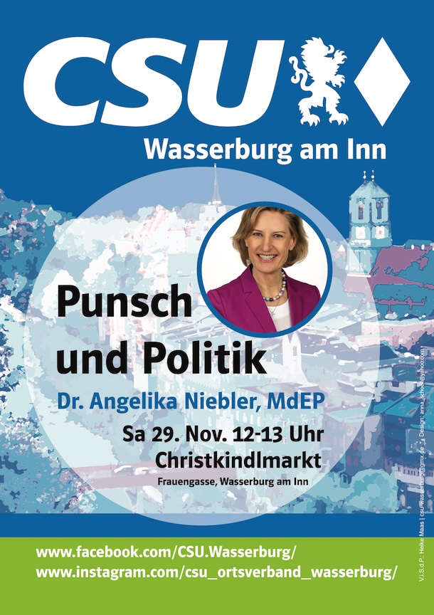 Die CSU Wasserburg lädt alle Interessenten herzlich zu „Punsch und Politik“ mit Prof. Dr. Angelika Niebler am Samstag, 29. November, von 12 bis 13 Uhr auf dem Wasserburger Christkindlmarkt hinter der Frauenkirche ein. Niebler, stellvertretende Parteivorsitzende der CSU und Präsidentin des Wirtschaftsbeirates der Union, ist seit 1999 Abgeordnete im Europäischen Parlament und langjährige Kreisrätin im Landkreis Ebersberg.
