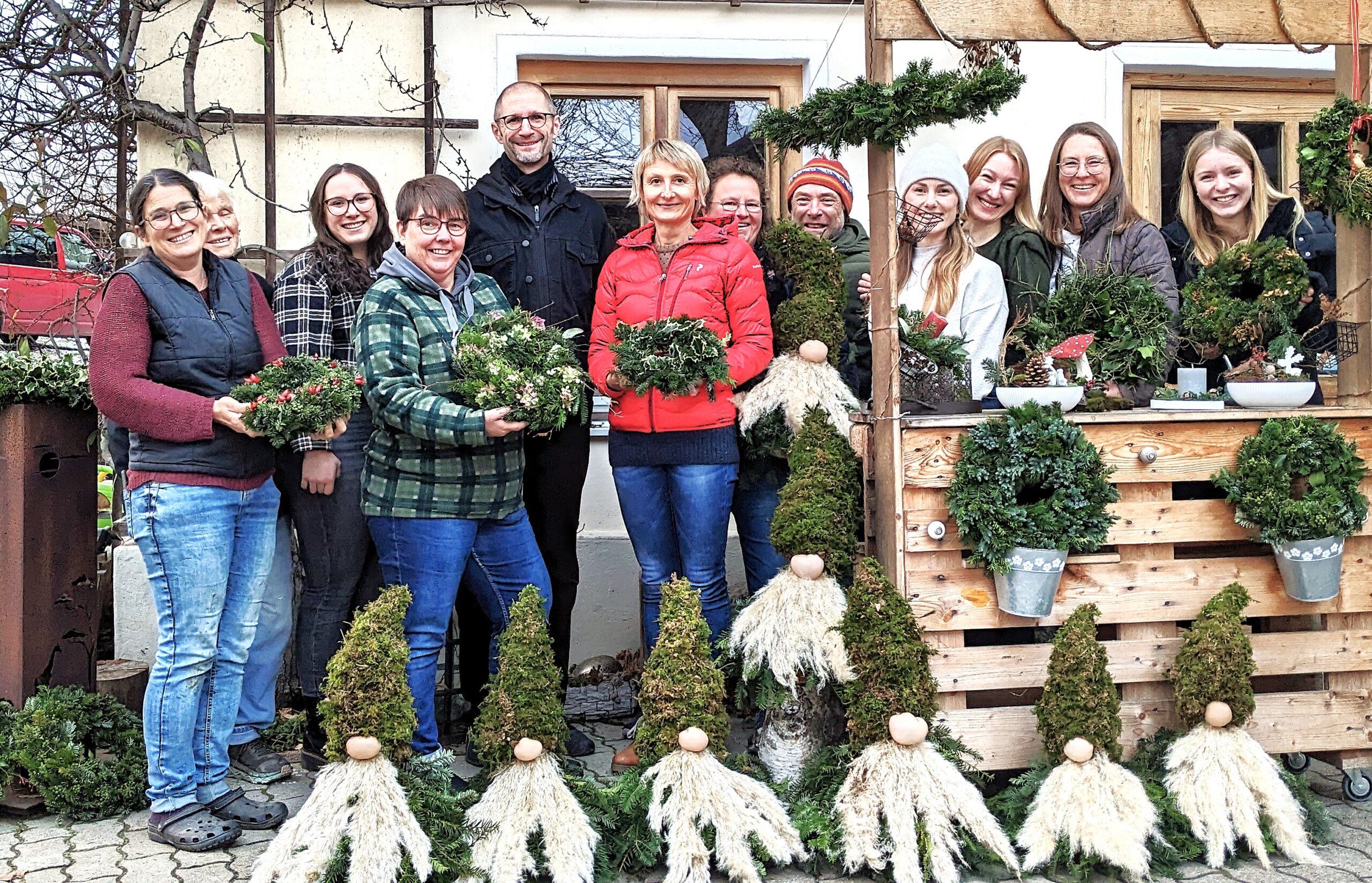 Die Frauen vom Kranzbinden freuten sich über den Besuch von Dr. Thomas Brei am Wasserburger Burgstallhof bei der Familie Kühn.
