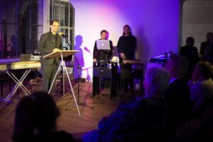 Im Anschluss entlockten die Musiker Thomas Kraus und Christian Friedrich dem Schlappophon (das oben erwähnte Musikinstrument mit den riesigen Röhren) und dem Synthesizer erstaunliche und beeindruckende Klänge und Melodien. Eine gelungene Klangperformance, ergänzt mit Thomas Paul Becker am Saxophon. Der Saxophonist unterstütze auch die Sopranistin Sieglinde Zehetbauer bei großartig gesungenen Evergreens wie „Moon River“ und „Memory“. Tosenden Applaus gab es für die Arie „ Lascia ch’io pianga“ , gesungen von Sieglinde Zehetbauer und kongenial begleitet von Thomas Kraus am Schlappophon.