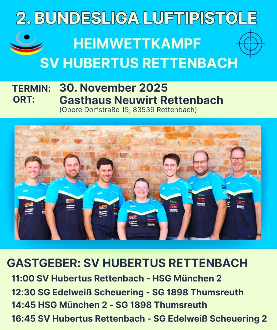 Für die Hubertus-Schützen aus Rettenbach steht in der 2. Bundeliga Süd der Luftpistolen-Schützen ein besonderer Sonntag bevor: Johannes Seitz, Tobias Spötzl, Christian Diepelt, Andreas Haas und Reinhard Ziegler haben um 11 Uhr ihren ersten Heim-Wettkampf 2025.