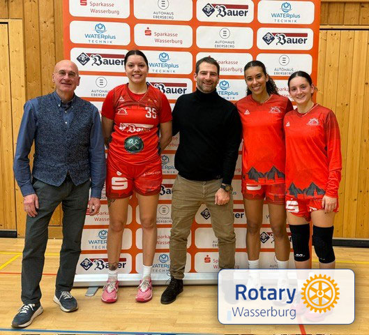 Robert Bendl (links) und Dr. Tassilo Singer vom Rotary-Club übergaben die Bälle an Neseya Williams, Tess Karina Michalke Santos und Marlene Stechl vom Wasserburger Basketballteam.