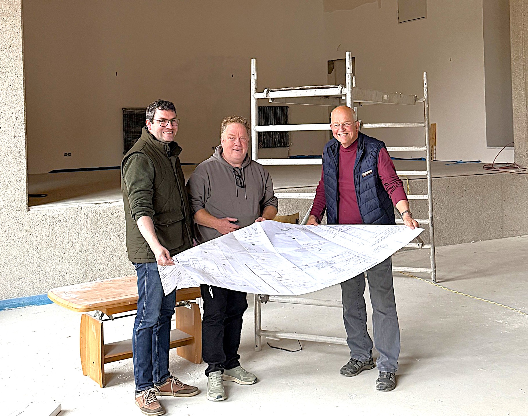 Verwaltungsleiter Christian Staber mit Wolfgang Evers. Vorsitzender des Rotter Theatervereins und Sebastian Mühlhuber, der Rotter Kirchenpfleger – hier bei der Feinabstimmung der Elektroplanung im Pfarrsaal.