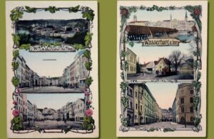 Mehrbild- oder auch Quodlibetkarten sind Karten, die mehrere Ansichten vereinen und durch Zier- und Rankenwerk gerahmt oder getrennt sind. Sie sind gerade um 1900 sehr beliebt. Die linke Karte vereint ein Panorama Wasserburgs von der Schönen Aussicht aus sowie zwei Blicke in die Ledererzeile Richtung Hofstatt und Richtung Burg.