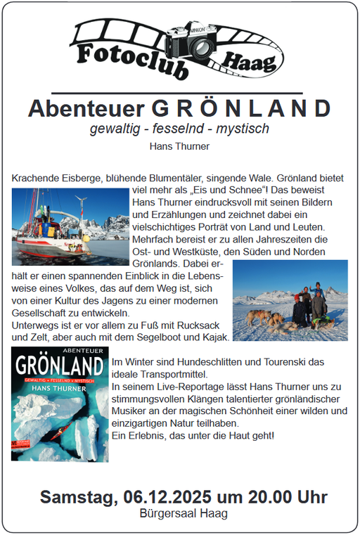 Krachende Eisberge, blühende Blumentäler, singende Wale: Grönland bietet viel mehr als „Eis und Schnee“. Das beweist Hans Thurner eindrucksvoll mit seinen Bildern und Erzählungen und zeichnet dabei ein vielschichtiges Portrait von Land und Leuten. Heute Abend berichtet er um 20 Uhr im Haager Bürgersaal – auf Einaldung des Fotoclubs.