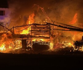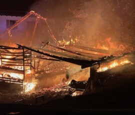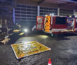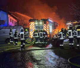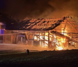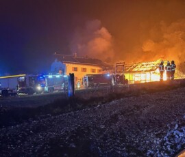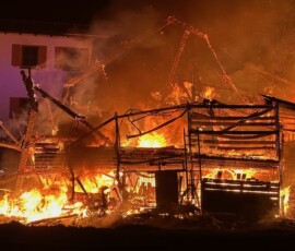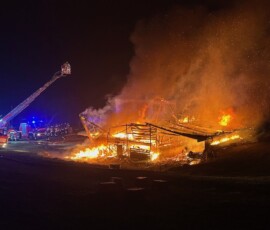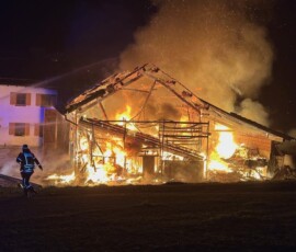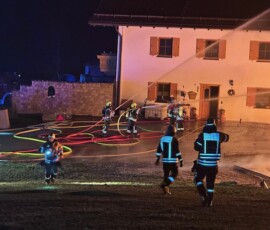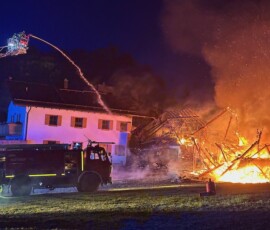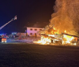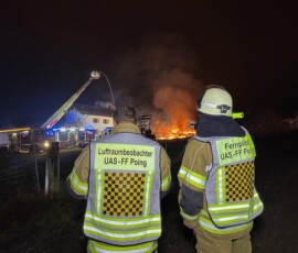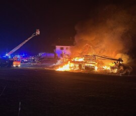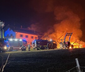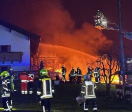 Kurz nach Mitternacht geriet am heutigen Samstag eine Scheune in Steinhöring, Ortsteil Kraiß, in Brand. Gegen 0.20 Uhr bemerkten Gäste, die in der Scheune feierten, ein Knistern und stellten anschließend fest, dass der Dachstuhl der Scheune brannte. Als ein Großaufgebot der umliegenden Feuerwehren eintraf, stand die Scheune bereits in Vollbrand, das Feuer hat auch schon auf das danebenstehende Wohnhaus übergegriffen. Während die Scheune vollständig abbrannte, konnte das Wohnhaus gerettet werden, meldet die Polizei. Fotos und Videos: Georg Barth