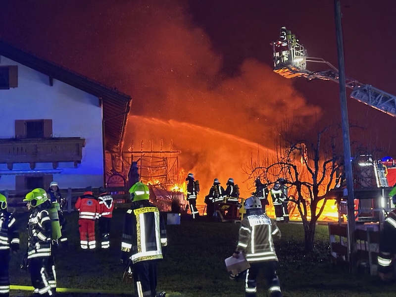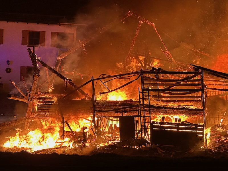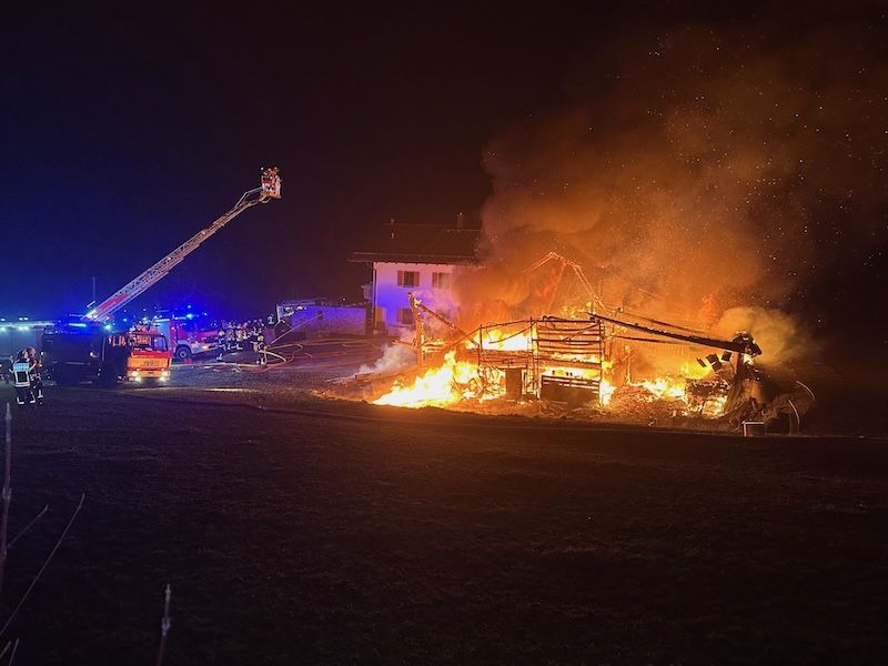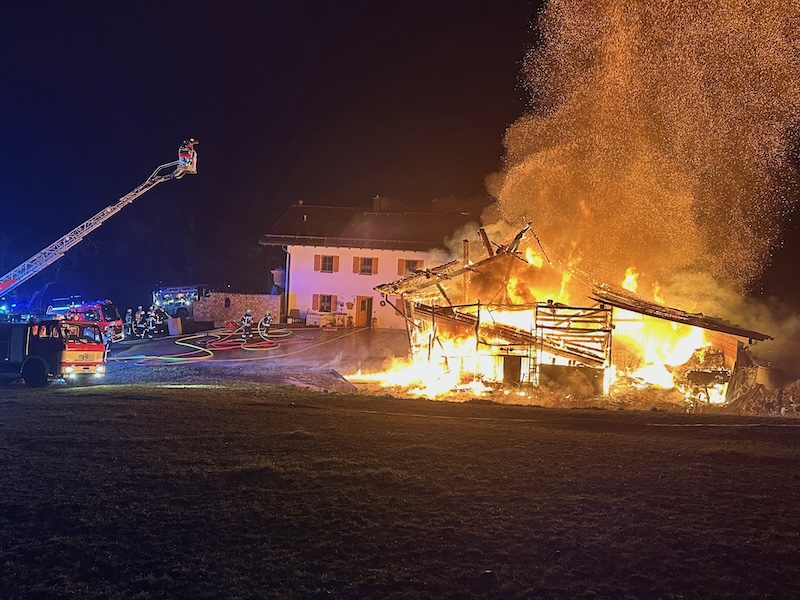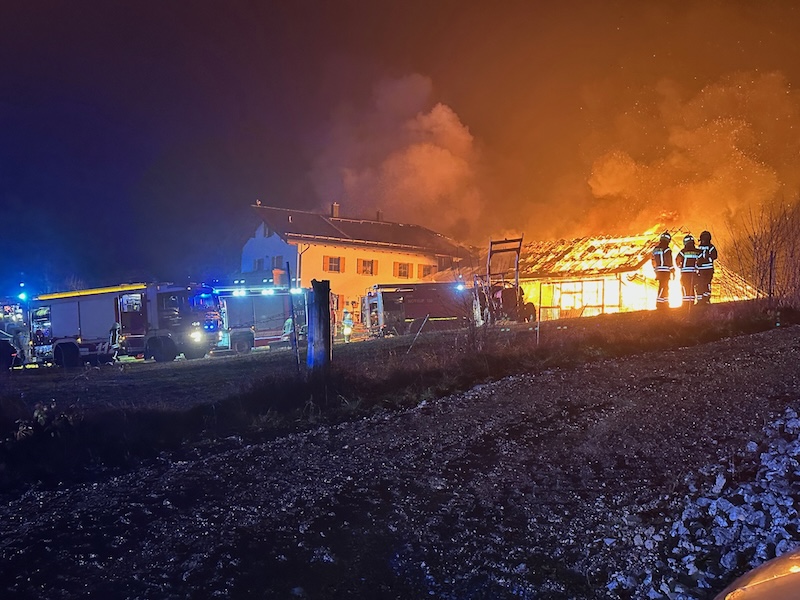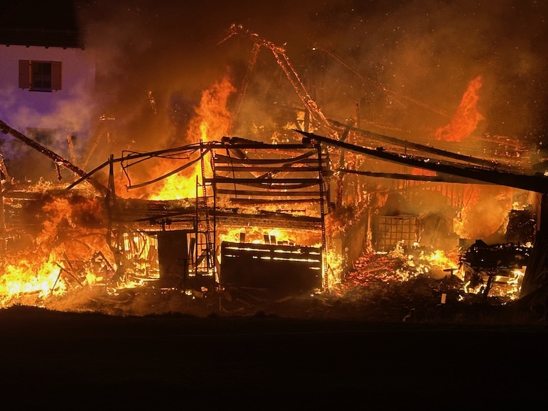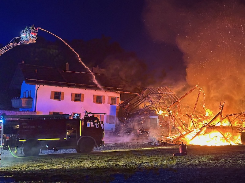 Kurz nach Mitternacht geriet am heutigen Samstag eine Scheune in Steinhöring, Ortsteil Kraiß, in Brand. Gegen 0.20 Uhr bemerkten Gäste, die in der Scheune feierten, ein Knistern und stellten anschließend fest, dass der Dachstuhl der Scheune brannte. Als ein Großaufgebot der umliegenden Feuerwehren eintraf, stand die Scheune bereits in Vollbrand, das Feuer hat auch schon auf das danebenstehende Wohnhaus übergegriffen. Während die Scheune vollständig abbrannte, konnte das Wohnhaus gerettet werden, meldet die Polizei. Fotos und Videos: Georg Barth