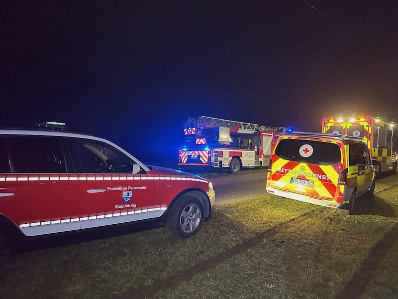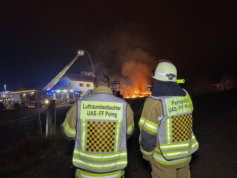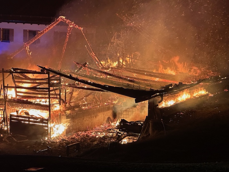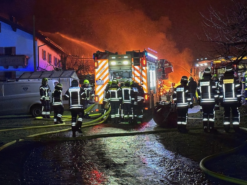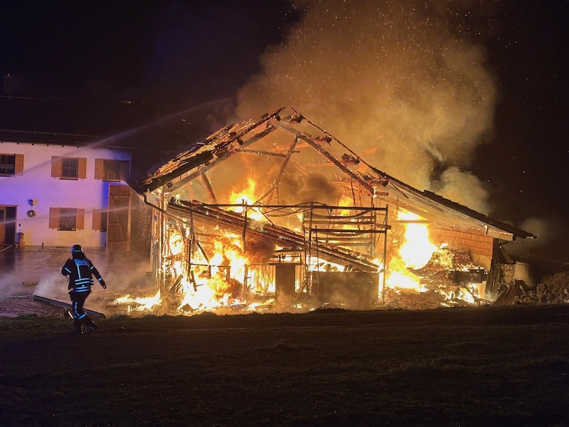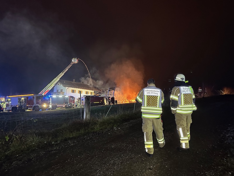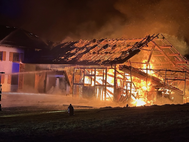 Kurz nach Mitternacht geriet am heutigen Samstag eine Scheune in Steinhöring, Ortsteil Kraiß, in Brand. Gegen 0.20 Uhr bemerkten Gäste, die in der Scheune feierten, ein Knistern und stellten anschließend fest, dass der Dachstuhl der Scheune brannte. Als ein Großaufgebot der umliegenden Feuerwehren eintraf, stand die Scheune bereits in Vollbrand, das Feuer hat auch schon auf das danebenstehende Wohnhaus übergegriffen. Während die Scheune vollständig abbrannte, konnte das Wohnhaus gerettet werden, meldet die Polizei. Fotos und Videos: Georg Barth