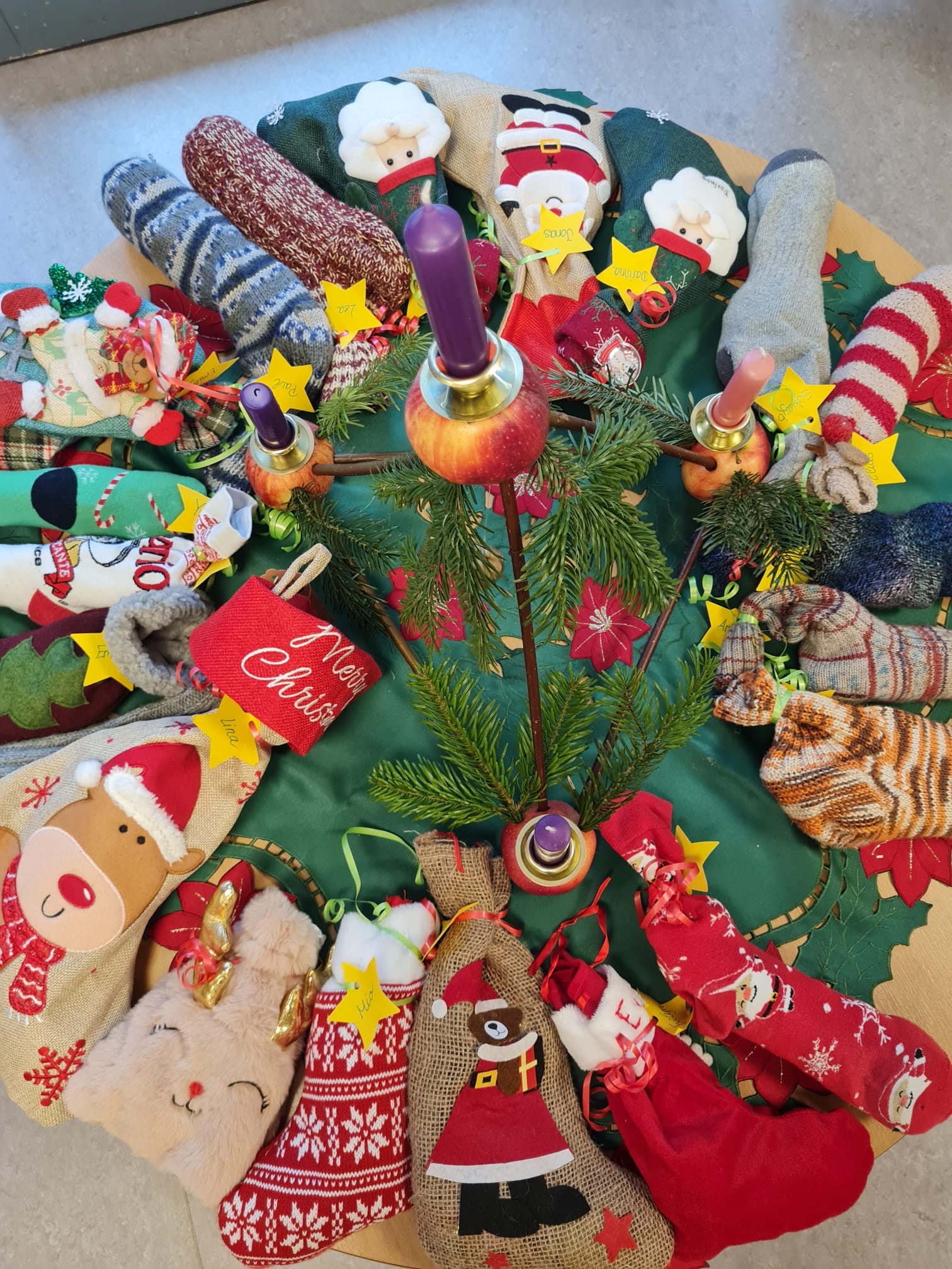 Jedes Kind brachte von zu Hause eine Socke für das Nikolausgeschenk mit und als die ganzen Socken gegen Mitte der Woche aus den Gruppenräumen verschwunden waren, war die Aufregung groß.