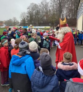 Die Kinder begrüßten den Besuch mit dem Lied „Sei gegrüßt lieber Nikolaus“. Der Nikolaus lobte die Kinder und auch die Lehrerinnen für ihren Einsatz, ihr freundliches Miteinander und die gute Stimmung im Schulhaus. Schön sei auch, dass in der Mittagsbetreuung viel gespielt und zusammen gelernt werde.