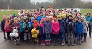 Außerdem bekam jedes Kind noch eine Tüte mit Schokolade, Nüssen und einem Apfel. „Jetzt freuen wir uns auf viele spannende Ballspiele in den Pausen“, so die glücklichen Kinder.
