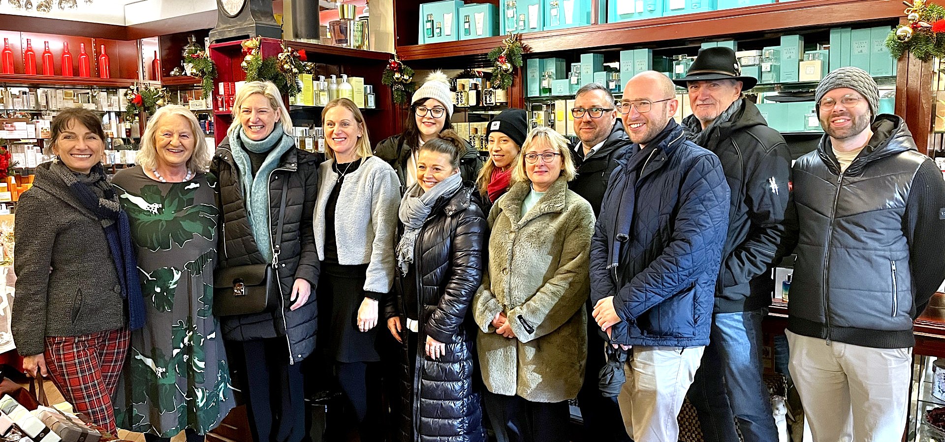 Das Foto zeigt die Station in der Wasserburger „Parfümerie Wierer“ beim Stadtspaziergang mit Dr. Angelika Niebler, Mitglied des Europa-Parlaments und stellvertretende Parteivorsitzende der CSU.