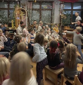 Ein Highlight des Nachmittags war für die kleinen Besucher das Kasperltheater, das eigens für den Weihnachtsbasar von den Erzieherinnen einstudiert wurde. Die Geschichte handelte vom Teilen in der Weihnachtszeit und griff so das Jahresmotto des Kindergartens „Miteinender – Füreinender” auch auf dieser Veranstaltung auf. Und war die Begeisterung der Kinder beim Stück nicht schon groß genug, so gab es am Ende noch eine riesige Überraschung: Zusammen mit den Darstellerinnen sangen die Kleinen das Lied „Schneeflöckchen-Weißröckchen” und sahen sich sodann inmitten von dicken Kunstschneeflocken aus einer Schneekanone.