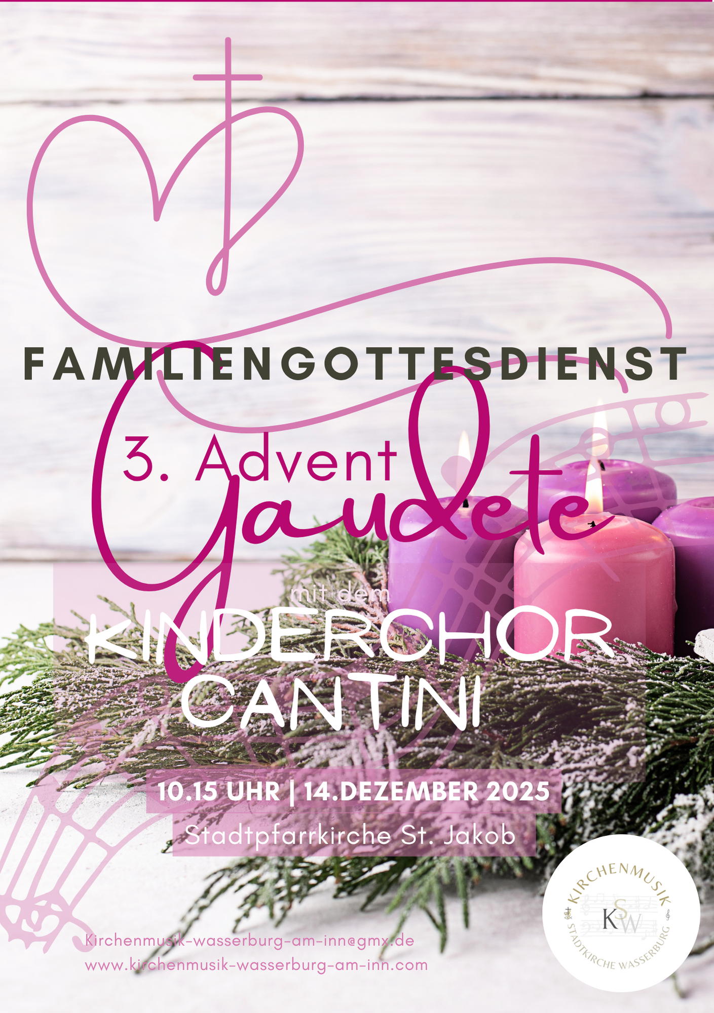 Herzliche Einladung ganz besonders an die Familien mit Kindern zu einem Gottesdienst am morgigen Sonntag, 14. Dezember, um 10.15 Uhr in der Wasserburger Stadtpfarrkirche St. Jakob: Zum dritten Advent wird die Messe musikalisch gestaltet vom Kinderchor Cantini unter der Leitung von Kirchenmusikerin Anja Zwiefelhofer.