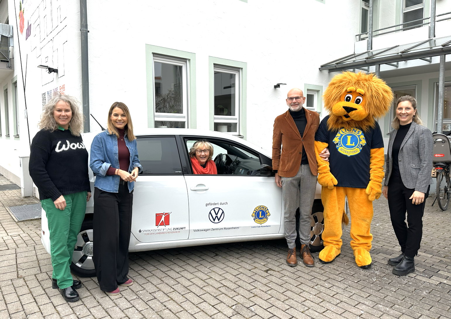 Groß war die Freude bei den Spendern und Sponsoren, die dem Kinderschutzbund die Anschaffung eines weiteren Dienstfahrzeugs ermöglicht haben: Thomas Möller, Präsident des Lions Clubs Rosenheim, der sogar das Lions-Maskottchen (Florian Reichelt, 1. Vorsitzender Lions Jugendförderung Rosenheim) mitbrachte, sowie Alexa Dietz, Geschäftsführendes Vorstandsmitglied der Sparkassenstiftung Zukunft für den Landkreis Rosenheim und Theresa Meisinger, Geschäftsführerin des Volkswagen Zentrums Rosenheim.