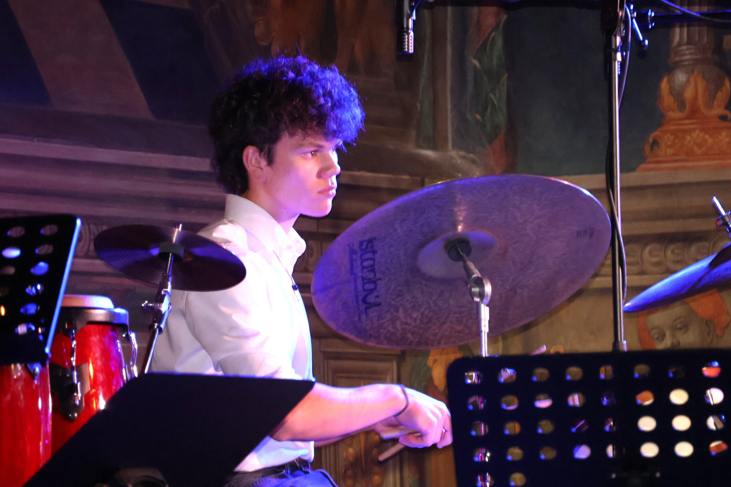 … und schließlich sorgte die Jazzband des Wasserburger Gymnasiums (siehe Titel-Foto ganz oben) für den krönenden Abschluss – unter der Leitung von Musiklehrer Thomas Ganzenmüller (Bild unten), der zusammen mit Nina Neuwald und Gisela Sandner wieder bravourös als Lehrer-Team die Gesamtleitung der Abende hatte.