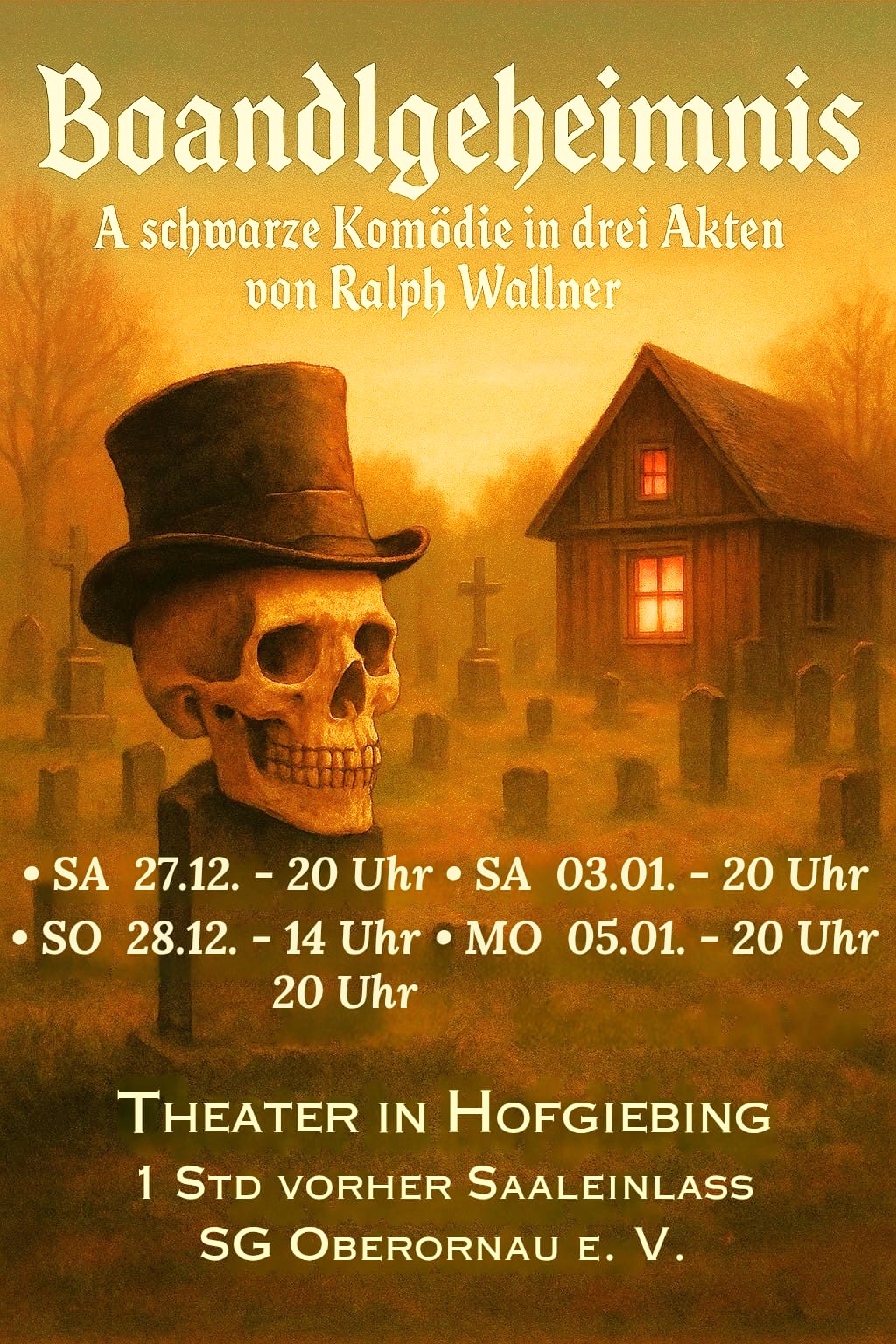Mit viel Herzblut, an guad’n Schuss Humor und der ganz eigenen Oberornauer Energie bringen wir heuer wieder ein Stück auf die Beine, des für beste Unterhaltung sorgen soll: Das „Boandlgeheimnis“ – eine schwarze Komödie in drei Akten von Ralph Wallner.