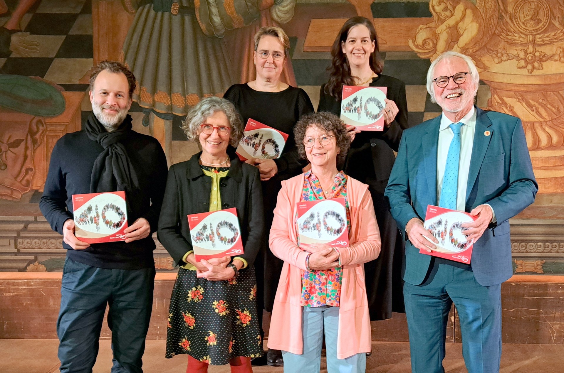 Sie präsentieren die neue Festschrift: LAG-Manager und Geschäftsführer Christian Fechter (links), Chorleiterin Angelica Heder-Loosli (vorne 2. von rechts), der Zweite Bürgermeister und Schirmherr Werner Gartner sowie Mitglieder des Chor-Vorstands.
