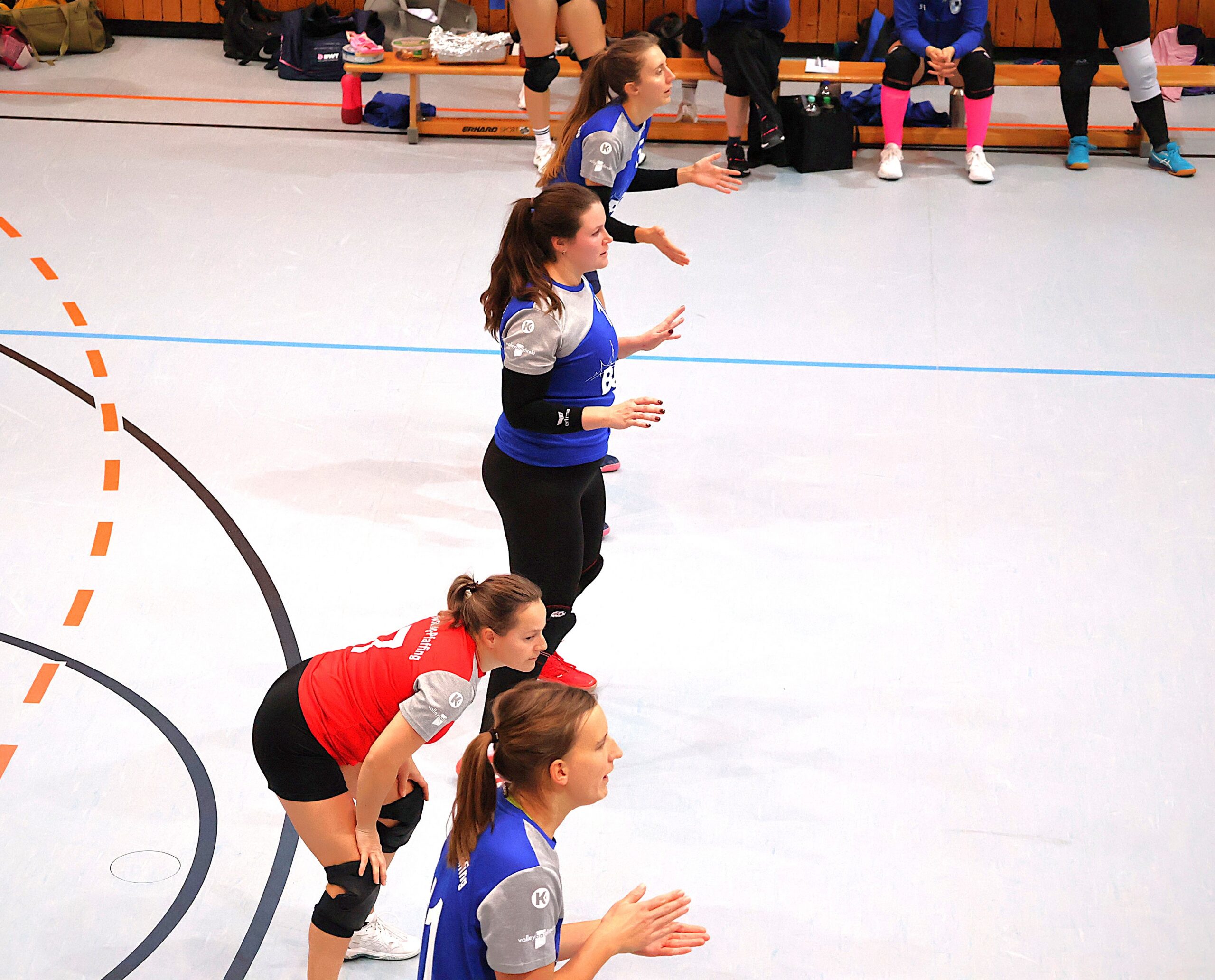 Auf der Auswechselbank hielt es bei der Heimmannschaft vom TSV Palling niemanden mehr – hinten rechts im Bild: Überaus spannende Wettkämpfe in zwei Begegnungen zeigten die Volley-Damen aus Pfaffing am jüngsten Spieltag der Bezirksklasse. Hier im Bild Kapitänin Alex Drax beim erfolgreichen Solo-Block – links Teamkollegin Franzi Haydn.