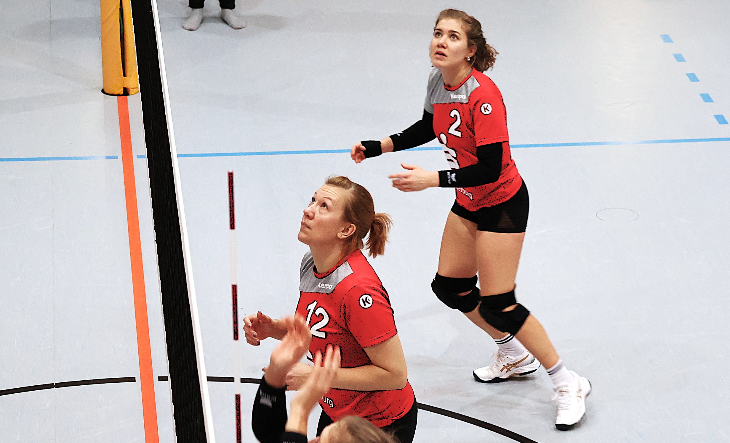 Außenangreiferin Franzi Haydn (links) in Aktion bei einem Schmetterball …