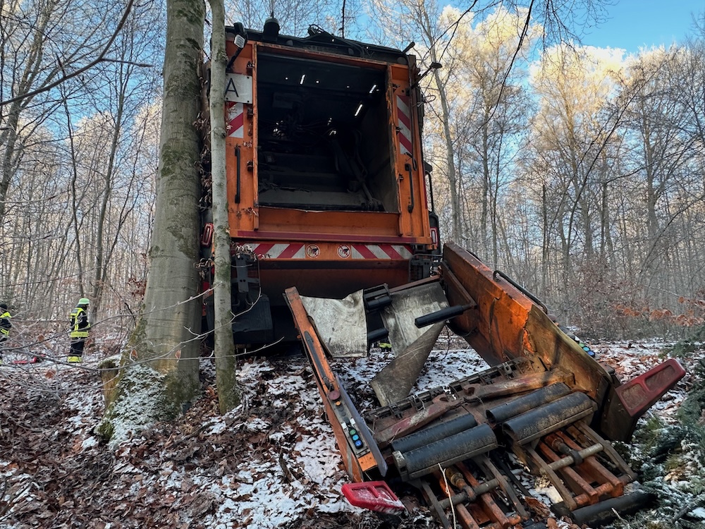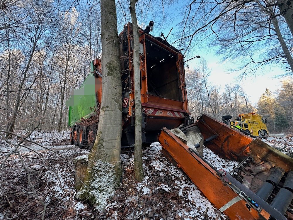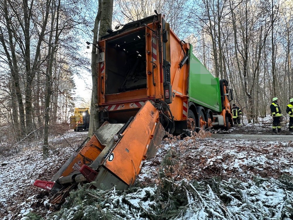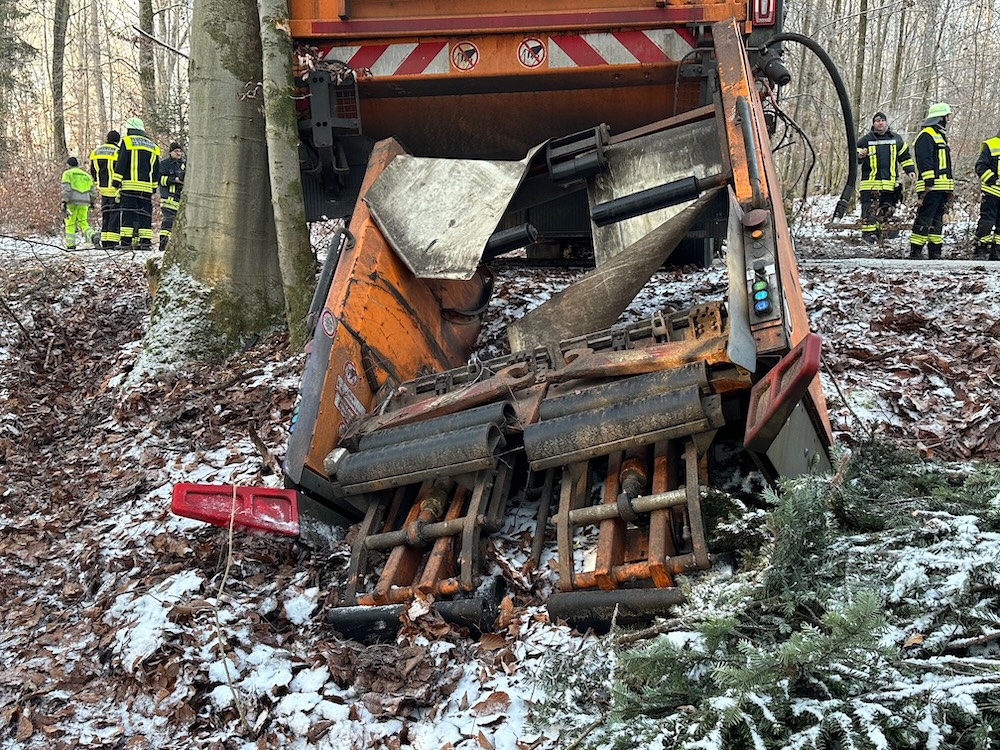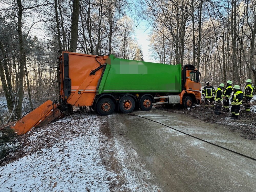 Mehrere Feuerwehren rückten am Samstagvormittag auf eine Gemeindeverbindungsstraße beim Weiler Schützen zwischen Albaching und Hohenlinden aus. Dort hatte der Fahrer eines Müll-Lkw die Kontrolle über sein Gefährt verloren. Der Lastwagen krachte in ein Waldstück und wurde schwer beschädigt. Die Bergungsarbeiten dauerten mehrere Stunden. Polizeibericht folgt. Fotos: Georg Barth