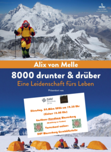Die Sektion Wasserburg des DAV freut sich, am Dienstag, 24. März, um 19 Uhr, im Gasthaus Staudham die erfolgreiche Extrembergsteigerin Alix von Melle mit ihrem aktuellen Vortrag „8000 drunter und drüber“ präsentieren zu können. Der Vorverkauf ist gestartet. Achtung: Es gibt nur 200 Plätze.