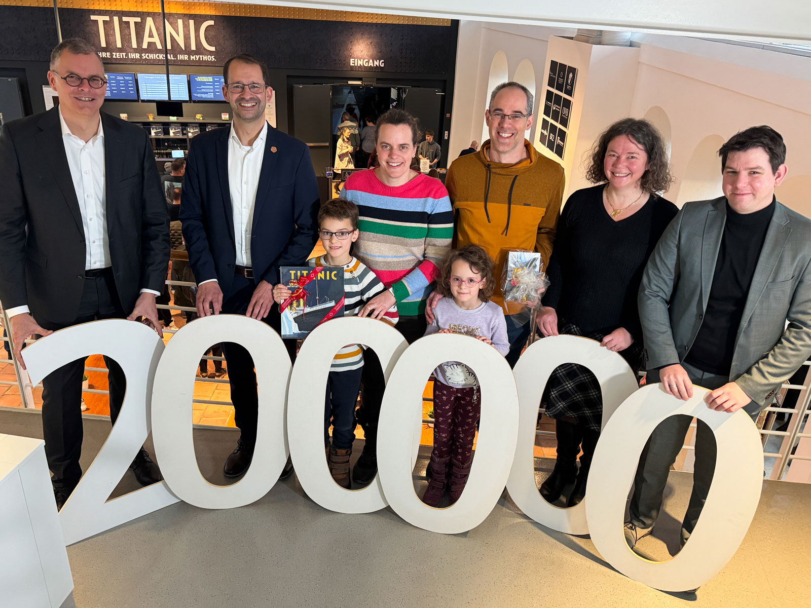 In der finalen Woche der Ausstellung „TITANIC – Ihre Zeit. Ihr Schicksal. Ihr Mythos.“ blickt man im Lokschuppen Rosenheim rundum in strahlende Gesichter: Kurz vor dem Ausstellungsende am 6. Januar überschritt die Schau die Marke von 200.000 Besucherinnen und Besuchern. Die vierköpfige Familie Sauer aus Baldham bei Vaterstetten war bei ihrem Spontanbesuch zur richtigen Zeit am richtigen Ort und wurde gebührend geehrt.
