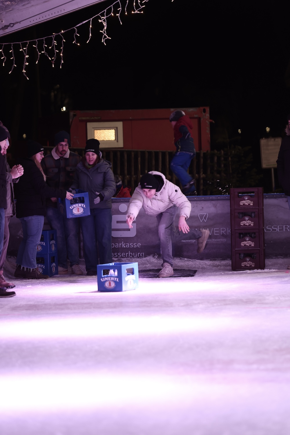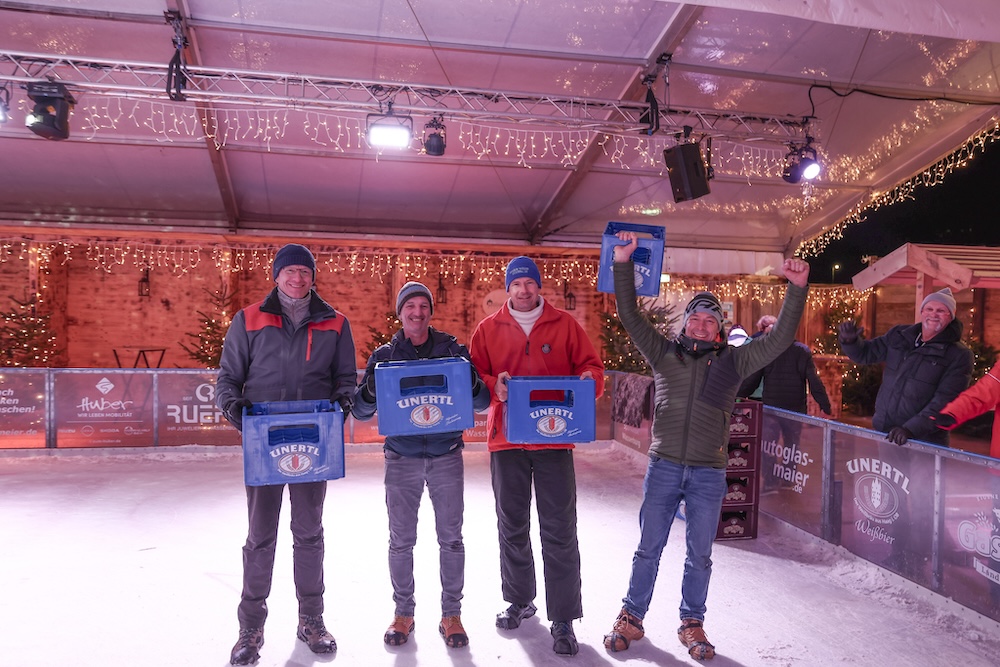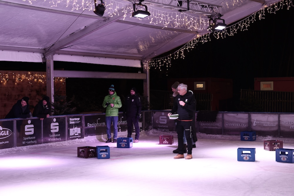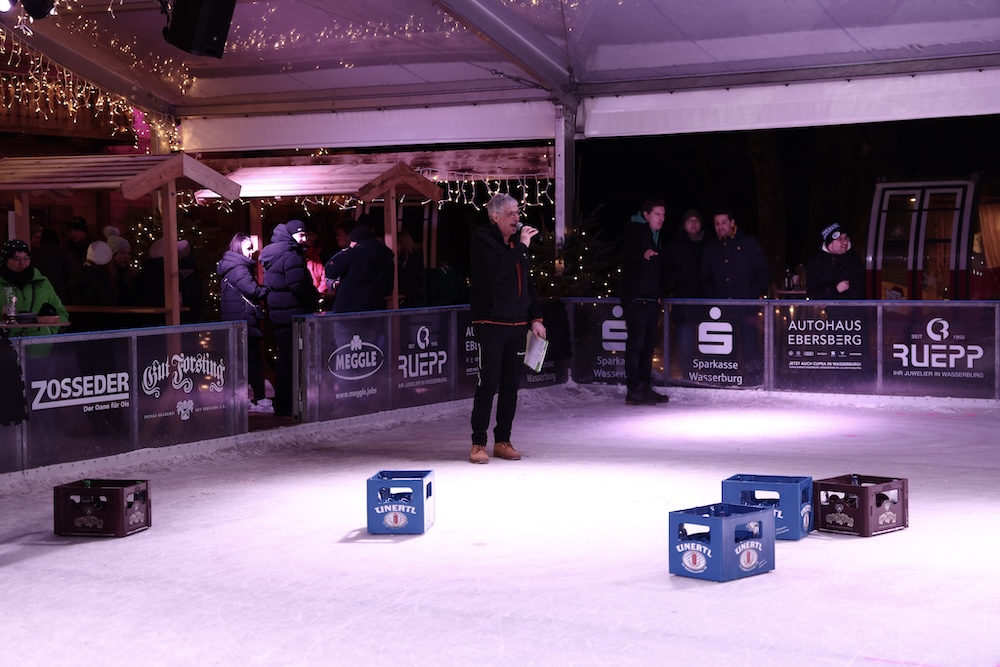 Sie ist alle Jahre einer der gesellschaftlichen und sportlichen Höhepunkte beim Eiszauber in Wasserburg: Die Meisterschaft im Bierkasten-Curling. Der Spaß darf dabei natürlich nicht zu kurz kommen. Und so war auch am gestrigen Samstag die Stimmung bis in den späten Abend hinein wieder bestens. Turnierleiter und Moderator war wie alle Jahre Herbert Zeilinger aus Haag. Als Sieger ging heuer die „Tschug-Bar“ aus Edling hervor, die sich im Finale gegen das Team „Lass-Lappen“ durchsetzte. Im Spiel um Platz drei siegte die AH des DJK-SV Edling gegen die „Gummibärenbande“. Aufgrund der großen Anzahl an Anmeldungen gibt’s am Montag nochmal ein Bierkasten-Curling mit über 20 Teams. Unser Fotograf Stefan Bodmeier war gestern mit von der Partie: