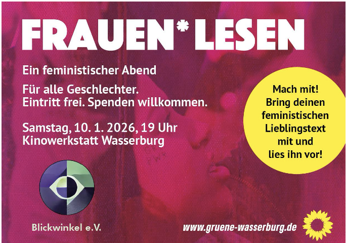 Nach dem großen Erfolg der ersten Lesenacht im Mai 2025 laden der Verein „Blickwinkel“ und die Wasserburger Grünen am 10. Januar ab 19 Uhr erneut zum feministischen Abend unter dem Motto „Frauen* lesen“ in die Wasserburger Kinowerkstatt ein. Menschen aller Geschlechter sind willkommen, denn Frauenrechte können nur gestärkt werden, wenn alle unterstützen.