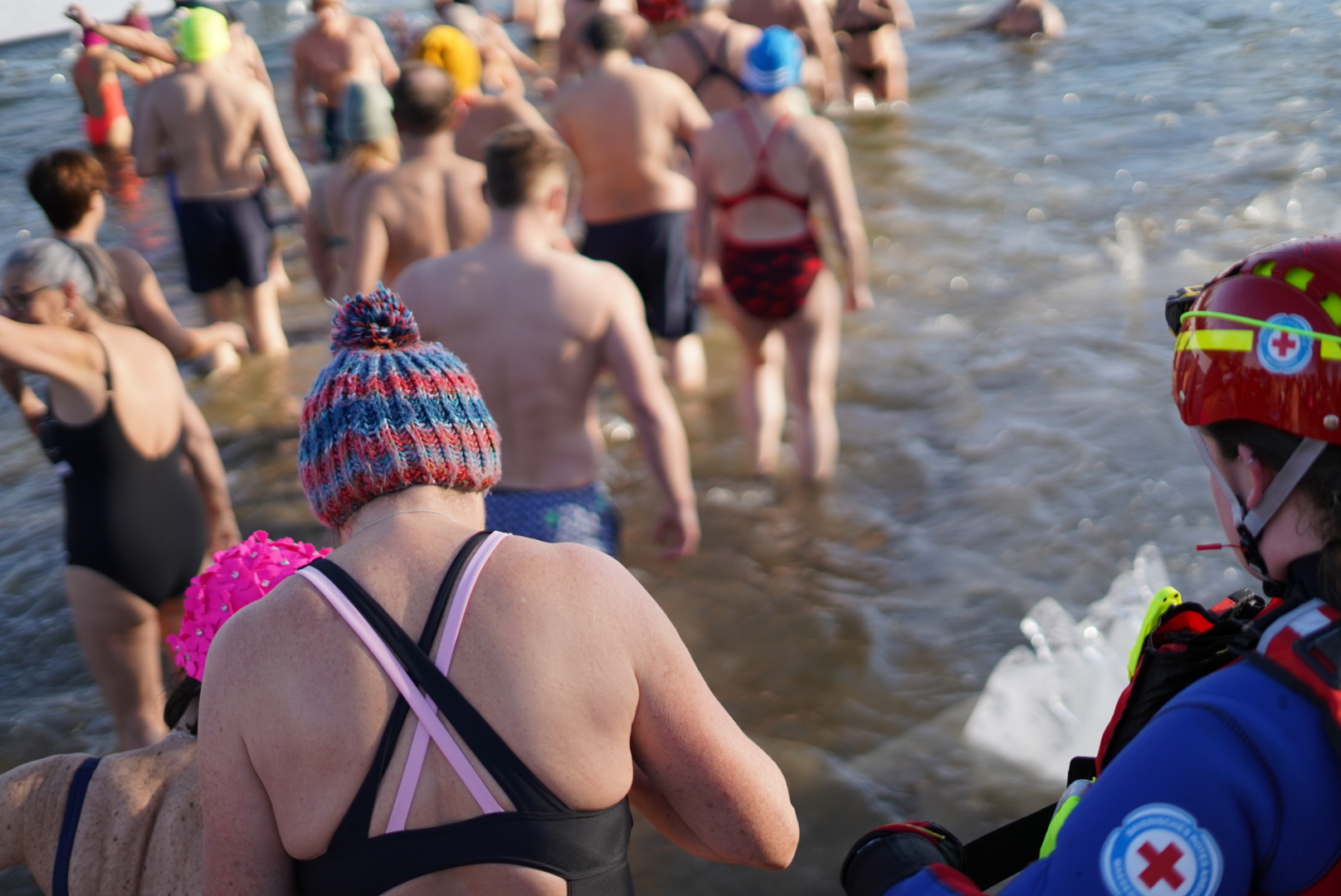 Moderiert wurde die Veranstaltung vom Vorsitzenden der Kreiswasserwacht Mühldorf a. Inn, Christian Goertz. Mit spannenden Fakten rund um das Eisschwimmen und den dahinterstehenden Brauch stimmte er das Publikum ein, leitete den Countdown zum Start ein und motivierte während der gesamten Veranstaltung immer wieder zu kräftigem Applaus für die Schwimmerinnen und Schwimmer.