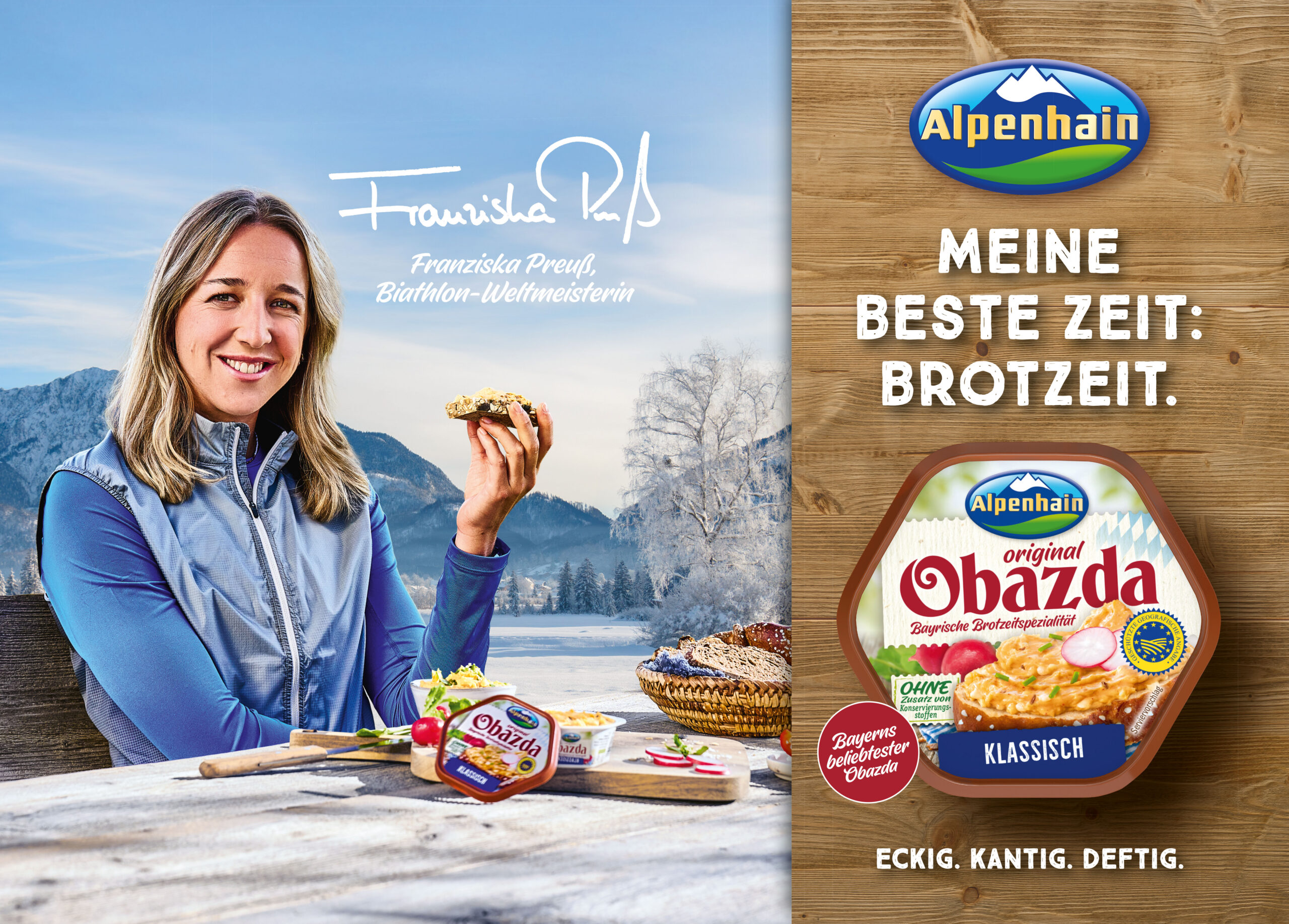 Mit einer aufmerksamkeitsstarken Out-of-Home-Kampagne rund um den BMW IBU Weltcup Biathlon in Ruhpolding richtet Alpenhain den Blick gezielt auf die internationalen Fans, die zum sportlichen Großereignis in die Region reisen. Die Kampagnenmotive zeigen Markenbotschafterin Franziska Preuß gemeinsam mit dem Original Obazda vor einem winterlichen Hintergrund und vermitteln Botschaften wie „Meine beste Zeit: Brotzeit“ und „Eckig. Kantig. Deftig.“ – ein klares Statement für Regionalität, Qualität und Genuss.
