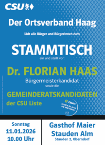 Die CSU Haag lädt am kommenden Sonntag, 11. Januar, um 10 Uhr ins Gasthaus Stauden Alm, Stauden zur Vorstellung ihrer Kandidaten für die Bürgermeister- und Gemeinderatswahl ein.