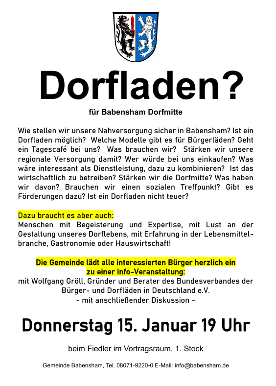 In der Dorfmitte von Babensham hat sich die Gemeinde eine Ladenfläche gesichert, um die Nahversorgung langfristig sicherzustellen. Am liebsten hätte man Metzgerware mit einer „heißen Theke“ und Mittagsangeboten, dazu ein Tagescafé auch als sozialer Treffpunkt und Waren für die tägliche Versorgung. Eben alles was ein typischer, sogenannter „Kramerladen“ anbieten würde. Das heißt es heute aus dem Rathaus.