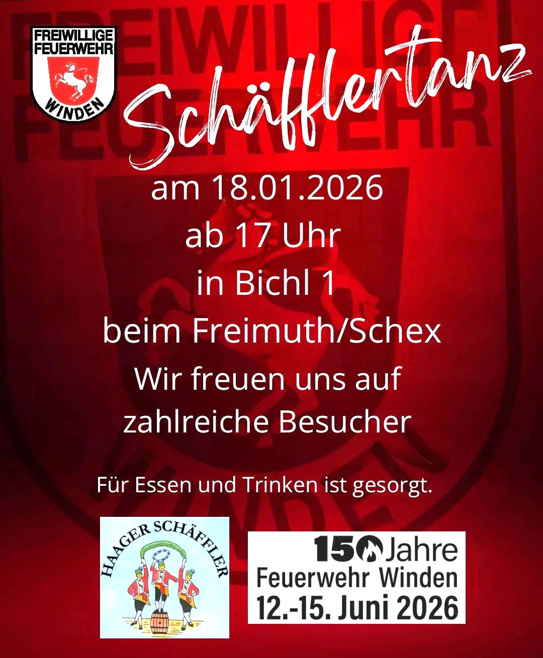 Ein besonderer Abend wartet – im großen Jubiläumsjahr zum 150-Jährigen: Die Feuerwehr Winden lädt am kommenden Sonntag, 18. Januar, herzlich zum Tanz der Haager Schäffler ein. Und zwar ab 17 Uhr in Bichl 1 beim Freimuth / Schex …