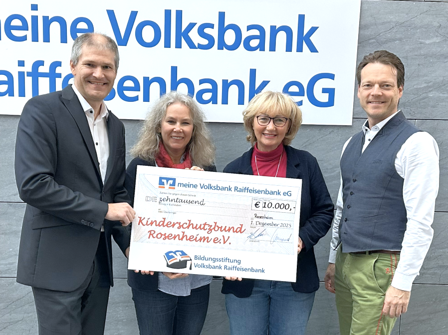 Voller Freude konnte der Kinderschutzbund Rosenheim jetzt eine hohe Spende der Bildungsstiftung der meine Volksbank Raiffeisenbank eG von 10.000 Euro in Empfang nehmen.