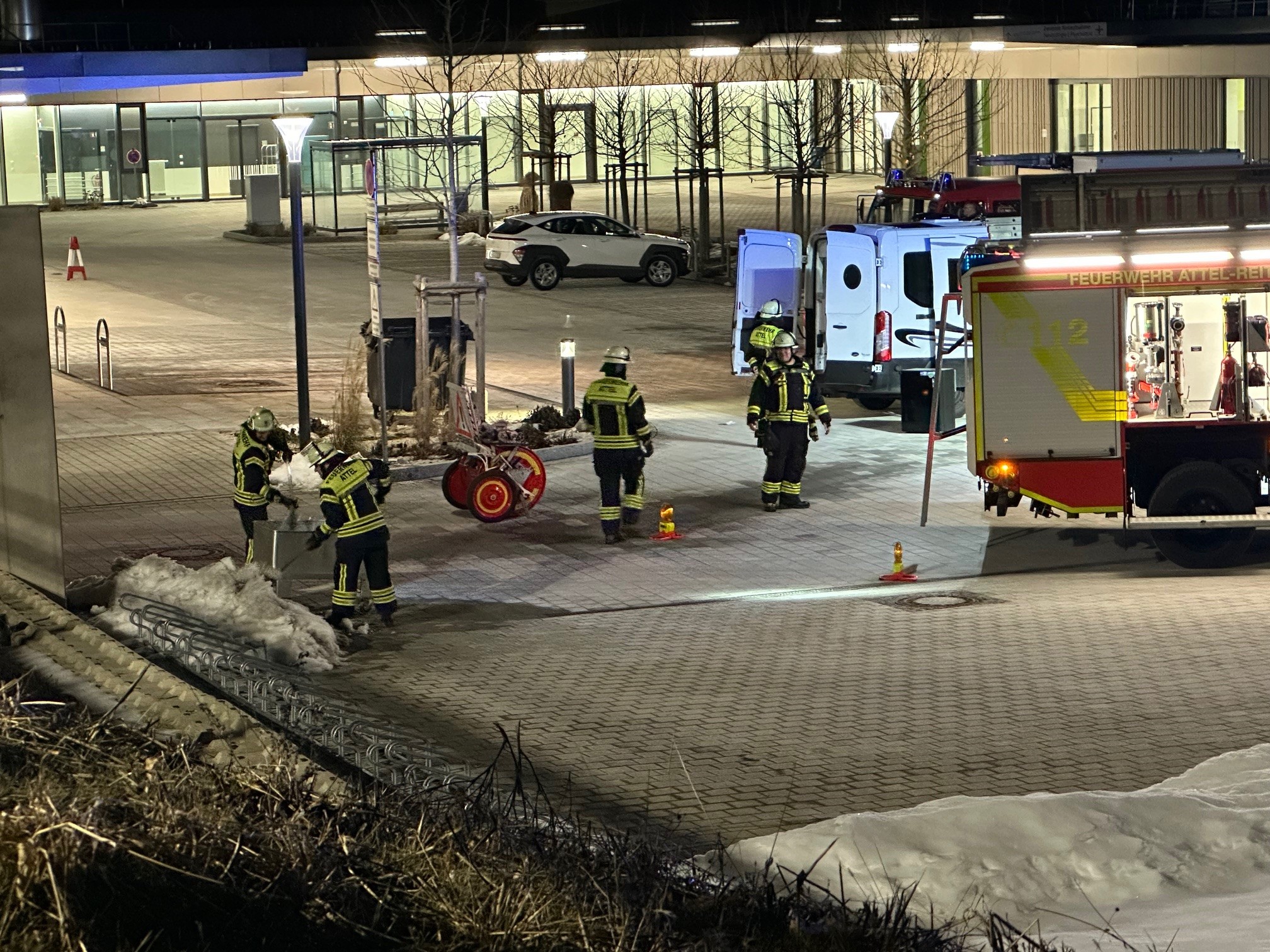 Alarm für die Feuerwehr Attel-Reitmehring am frühen Dienstagabend: Gegen 18 Uhr rückten die Floriansjünger in Richtung der Kliniken in Gabersee aus. Auf einem der Parkplätze brennt ein abgestelltes Reisemobil. Polizeibericht folgt. Fotos: Georg Barth