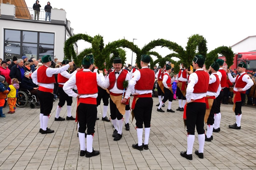 Passend zum Liadl: „Ja, heid is koid … und glei so vui Leut.“ Es wurde geradezu zu einem Veranstaltungs-Hit in Forsting – der Auftritt der Wasserburger Schäffler auf dem Hof der Firma KERAMIK | DESIGNS von Christian Rakowsky (Bildmitte), der Fachhandel für Fliesen, Mosaik, Naturstein.