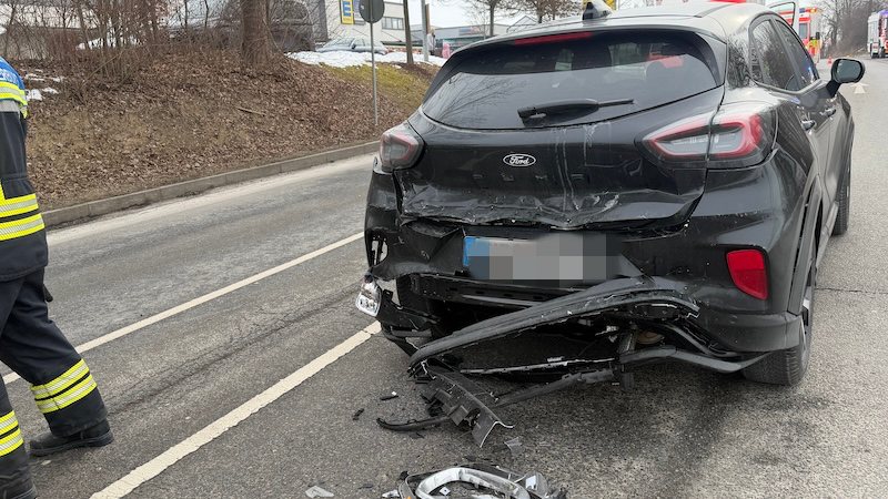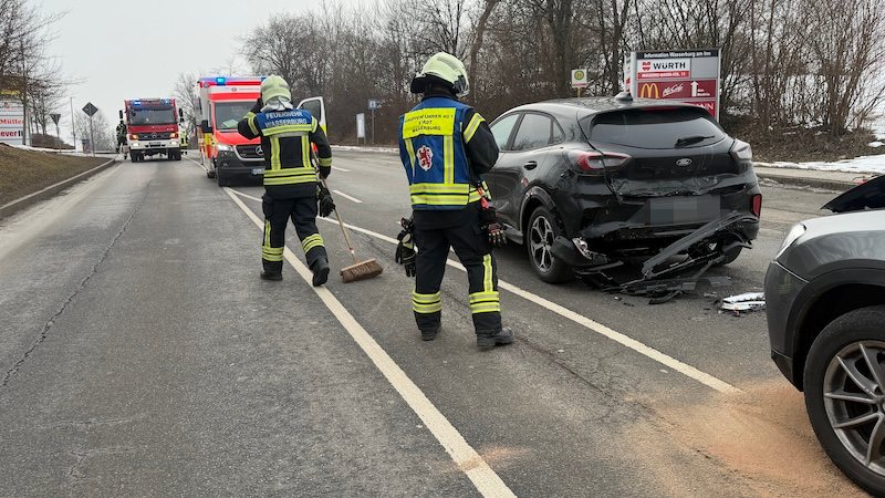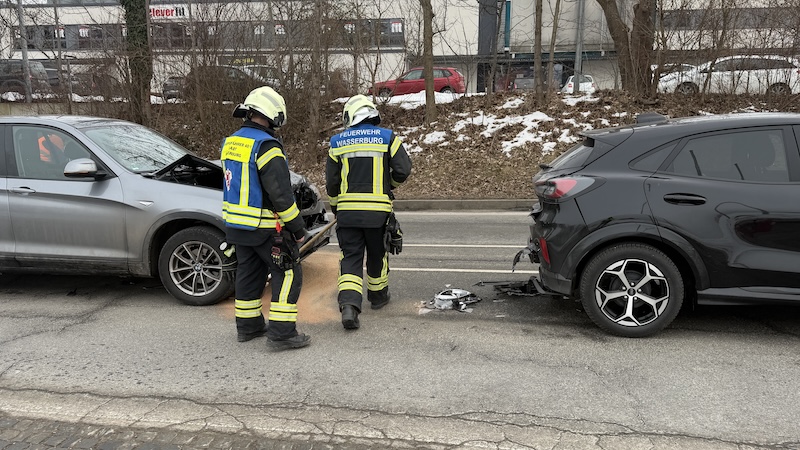 Bei einem Auffahrunfall auf der Staatsstraße 2092 in Wasserburg heute gegen 14 Uhr wurden drei Personen leicht verletzt und zwei Pkw erheblich beschädigt. Der 54-jährige Fahrer eines BMW X3 fuhr von Babensham kommend in südlicher Richtung hinter einer 78-jährigen Fahrerin eines Ford Puma. Die Ford-Fahrerin bremste ab, um links zum Edeka-Markt abzubiegen und sich auf der Linksabbiegespur einzuordnen. Der BMW-Fahrer übersah das Abbremsen und fuhr auf den vorderen Pkw auf.