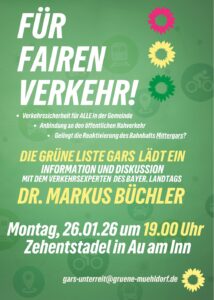 Am kommenden Montag, 26. Januar, um 19 Uhr findet als Auftakt zur Kommunalwahl eine Informationsveranstaltung der Garser Grünen mit dem Verkehrsexperten des bayerischen Landtags, Dr. Markus Büchler, im Zehentstadel in Au am Inn statt.