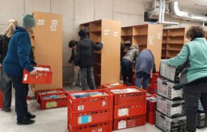 Bis zur Fertigstellung der neuen Büchereiräume sind die Medien nun sicher im Depot des Zehentstadels eingelagert. Beim Einzug in die neuen Räume wird der Umzug deutlich komfortabler: Dann müssen die Bücher nur noch mit dem Aufzug nach oben gebracht werden.