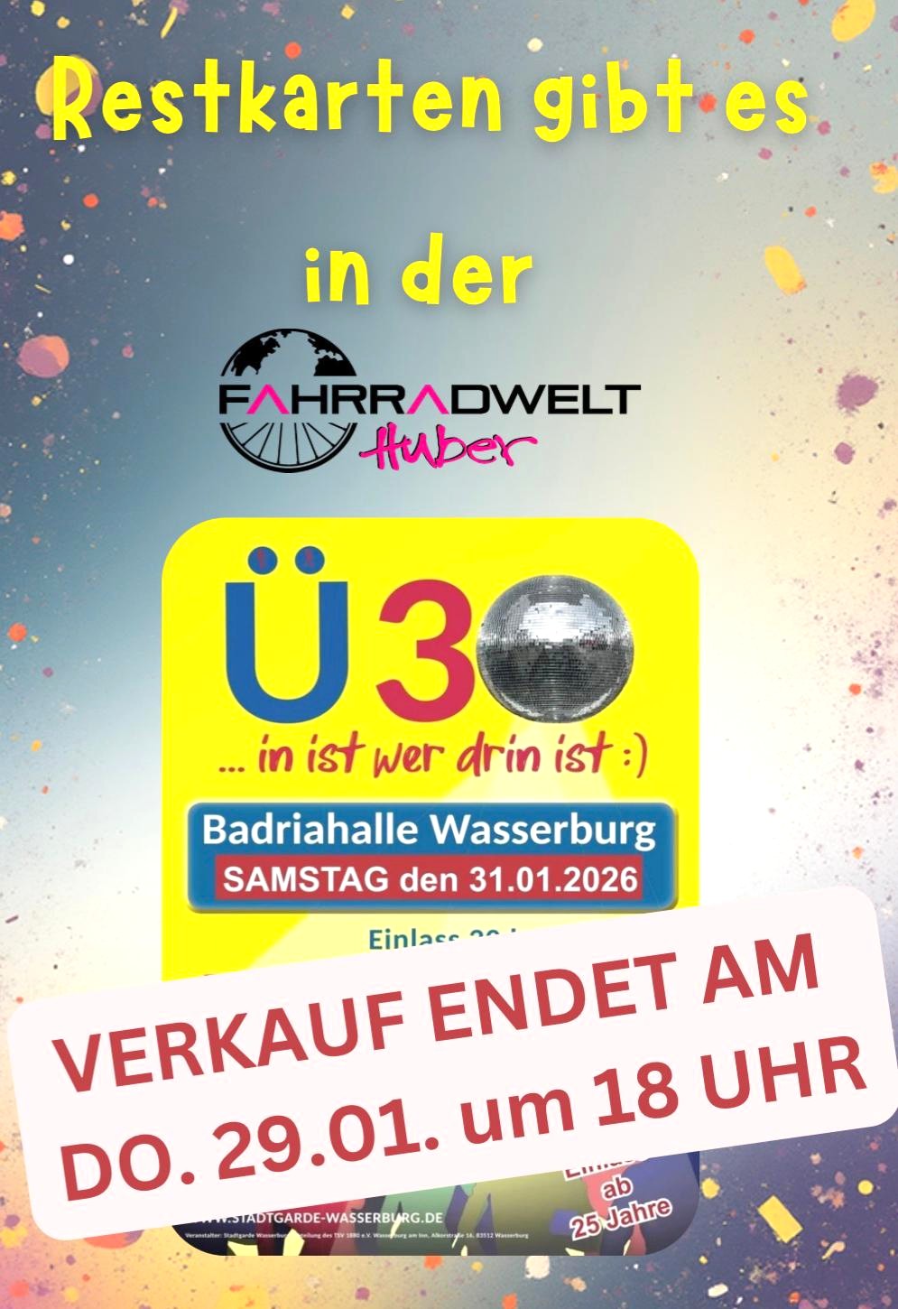 Der Ü30-Hit im Wasserburger Fasching am kommenden Samstag in der Badria-Halle – er ist so gut wie ausverkauft, melden die Veranstalter aktuell. Das heißt: Eine geringe Chance besteht noch für Kurzentschlossene, die Restkarten heute bis spätestens 18 Uhr zu ergattern. Quasi – solange der Minimal-Vorrat noch reicht.
