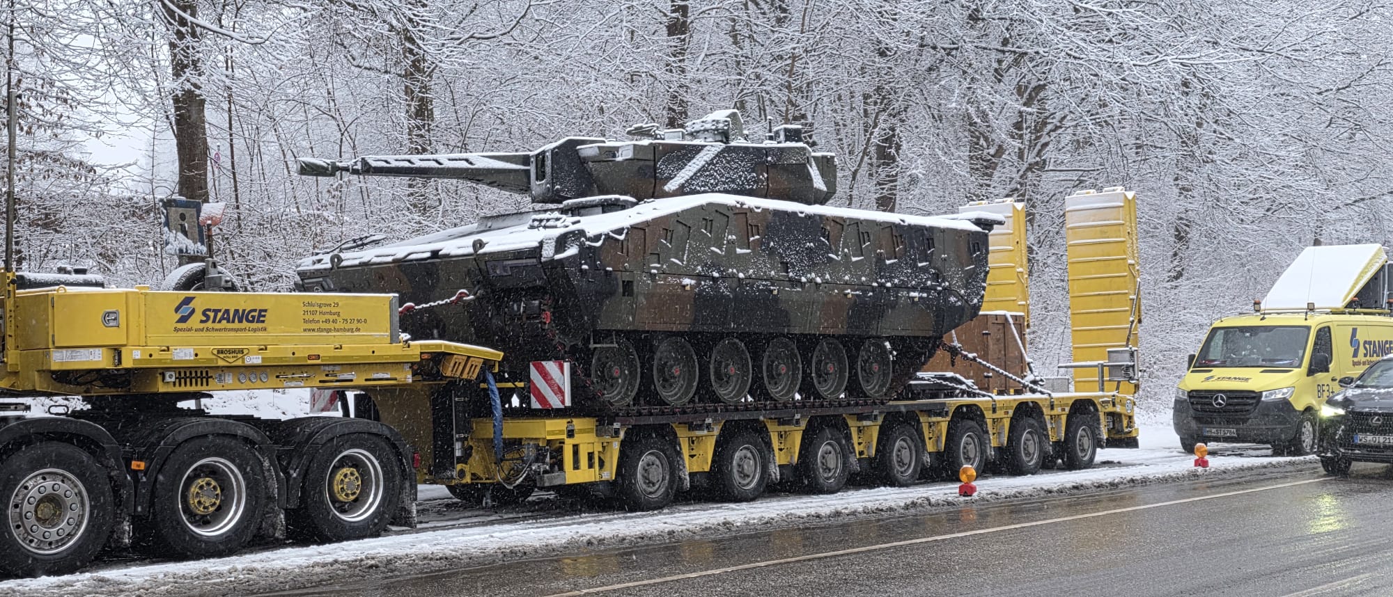 Für einiges Aufsehen sorgt seit heute Morgen in Wasserburg ein Schwertransport aus Hamburg. Der Tieflader mit Begleitfahrzeugen steht in Gabersee am Straßenrand und muss dort wegen der winterlichen Straßenverhältnisse Halt machen. Geladen hat der schwere Lkw einen Schützenpanzer Puma von Rheinmetall. Der Panzer wurde von der italienischen Armee bestellt und muss noch über den Brenner, wie die Hamburger Transportfirma Stange auf Anfrage der Wasserburger Stimme mitteilte. Allerdings darf der gesamte Transport erst heute Abend um 20 Uhr weiterfahren – wenn der Wetterbericht zutrifft und die Schneefälle dann ein Ende haben. Foto: TP