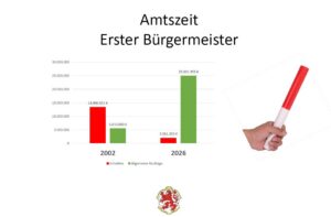 „Ganz besonders freue ich mich, dass ich zum Stabwechsel als Bürgermeister den besten Haushaltsplan mit der besten Ausgangslage in neue Hände übergeben darf“, so der Rathaus-Chef. Bei seinem Amtsbeginn 2002 standen noch 13.480.551 Euro an Schulden 5.610.863 an allgemeinen Rücklagen gegenüber.
