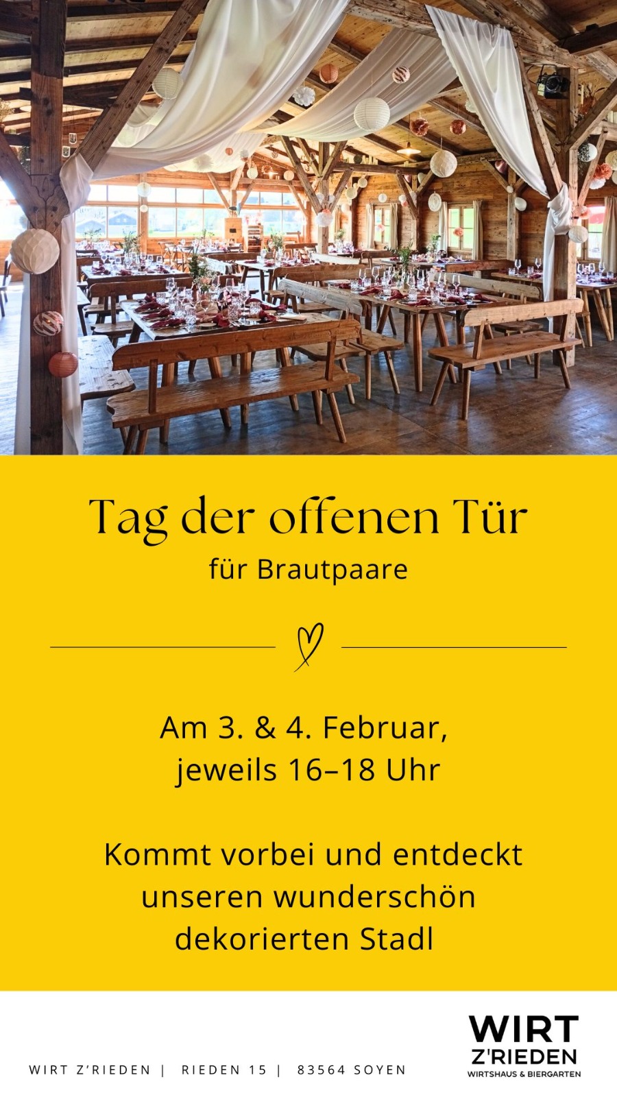 PR – Der Eventstadl beim Wirt in Rieden – ein Ort für ganz besondere Momente. Ob Hochzeiten, Geburtstags- oder Firmenfeiern, wer es außergewöhnlich haben will, ist in Rieden genau richtig. Damit man sich ein Bild vom Stadl machen kann, findet kommende Woche am Dienstag und Mittwoch, 3. und 4. Februar, jeweils ein Tag der offenen Tür statt. Brautpaare und andere Interessenten können sich von 16 bis 18 Uhr ein Bild vom wunderschön dekorierten Stadl machen.