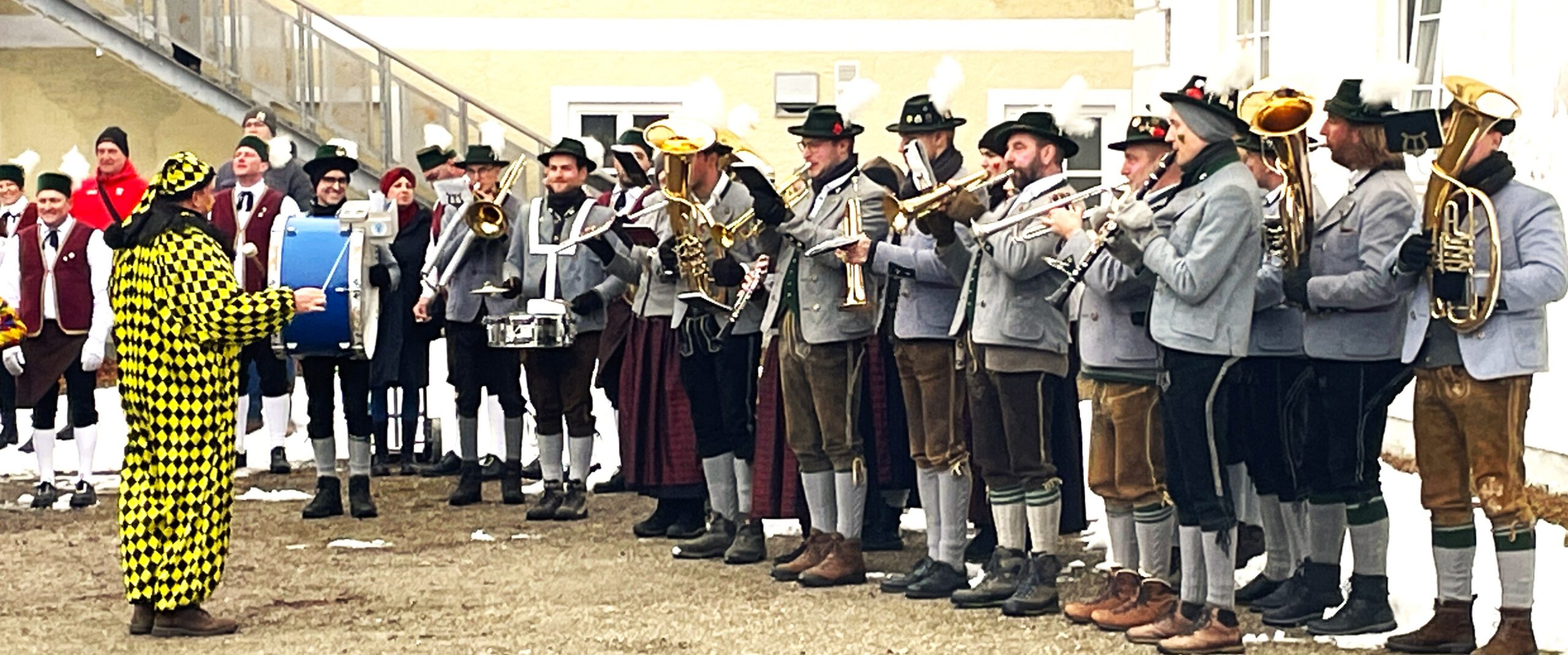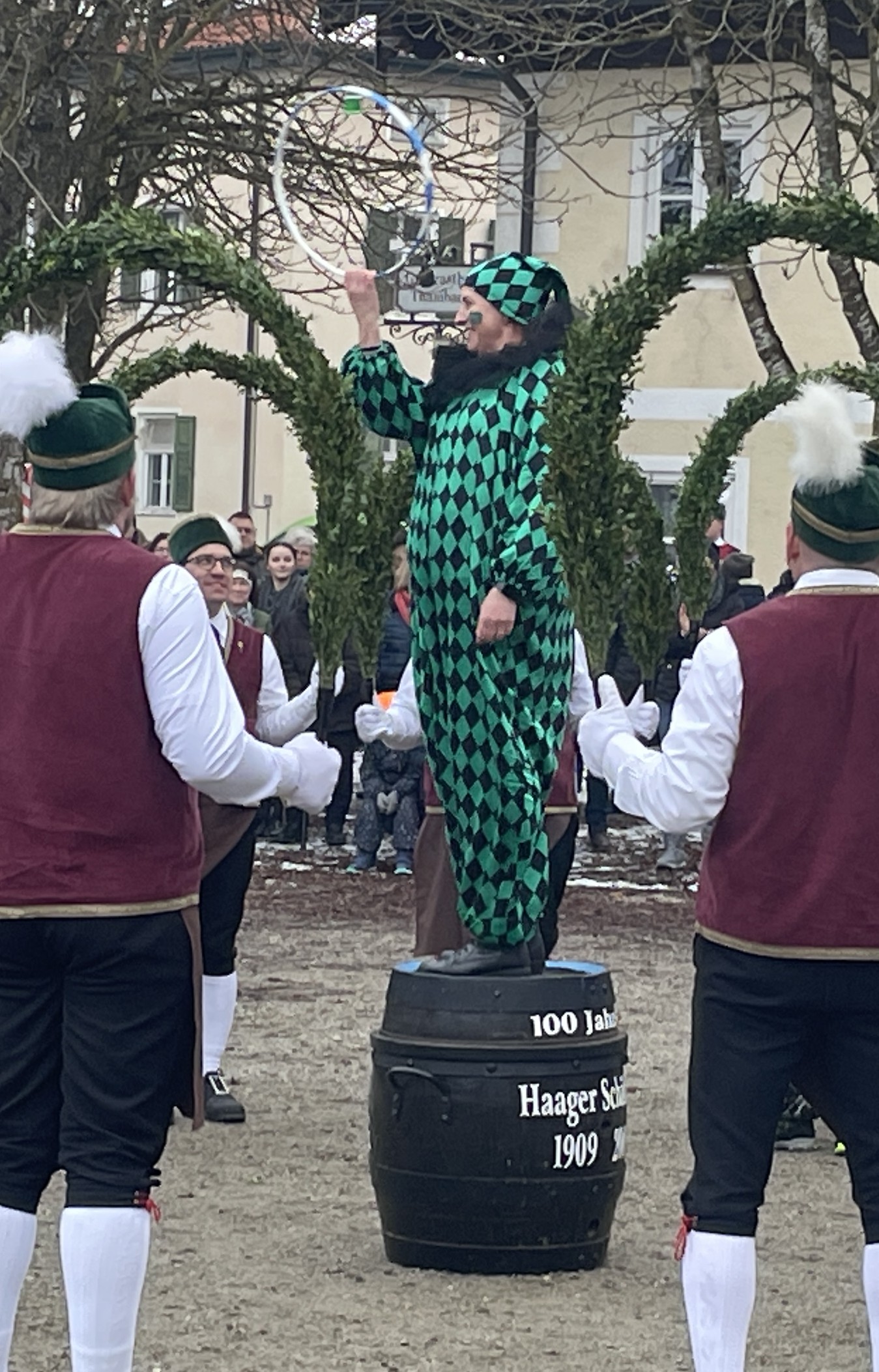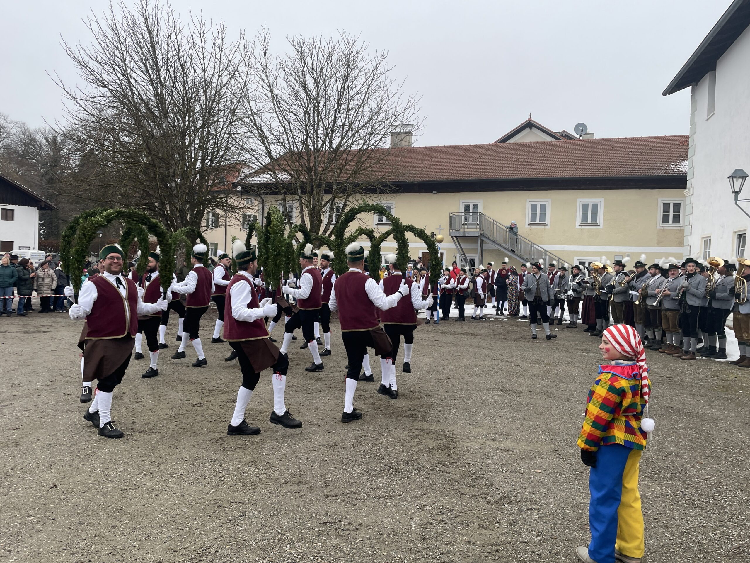 Rund 500 Besucher kamen in Thambach dank der Ortsvereine zusammen, um den Schäfflertanz zu sehen. Unter den Klängen der Trachtenblaskapelle Ramsau marschierten die Haager Schäffler – begleitet von den Spaßmachern im Kasperlgwand – auf das Gelände am Gutshof in Thambach ein.