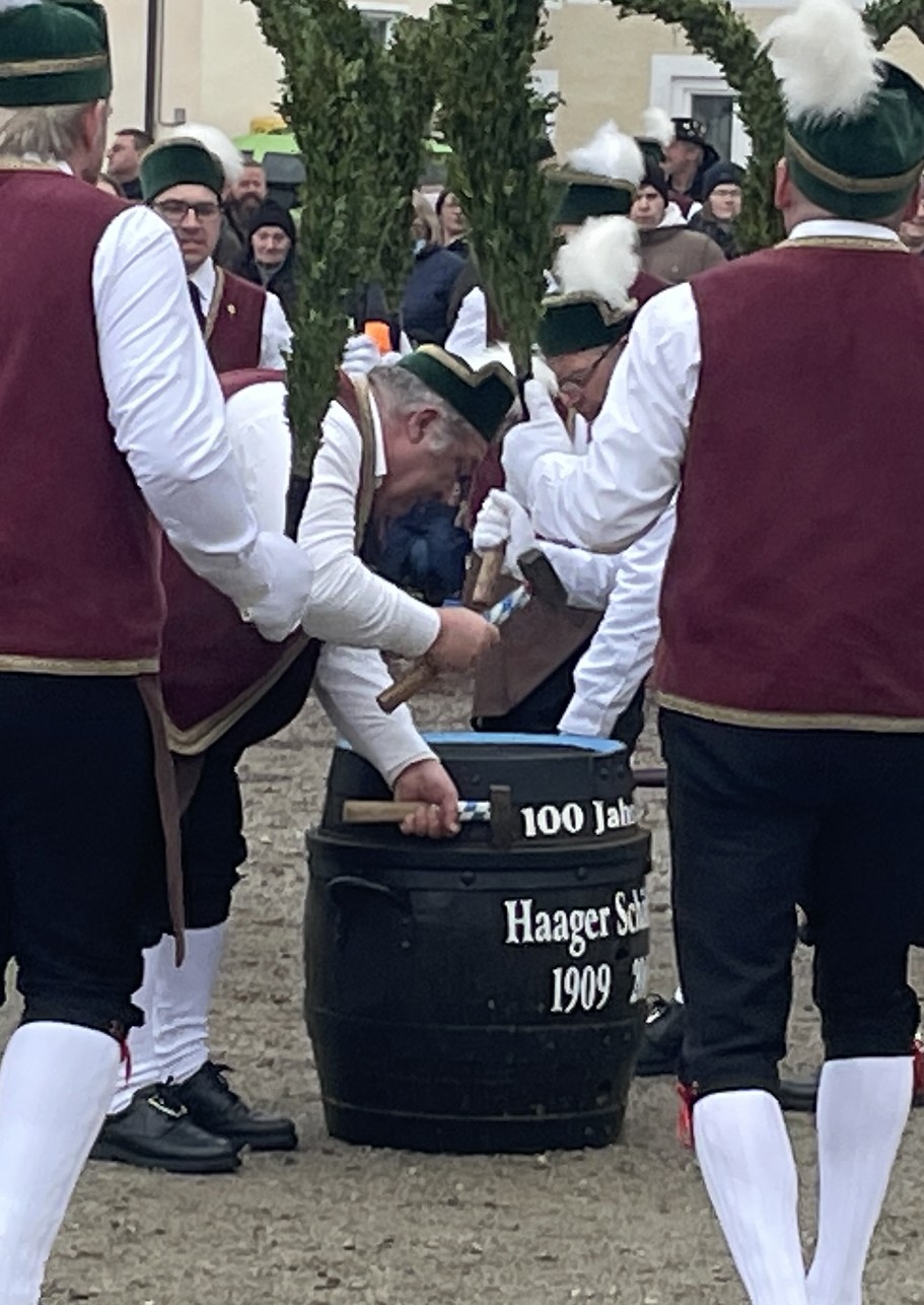 Mit ihrem aus verschiedenen Figuren bestehenden Tanz, die mit den in Buchs eingebundenen Bögen gebildet werden, verbreiteten sie dem Sinn des Brauchtums entsprechend Lebensfreude und Zuversicht. Gekonnt balancierten die Reifenschwinger mit rasantem Schwung ein volles Schnapsglas und im Takt der Musik wurden von zwei Schäfflern die Reifen auf ein Fass geschlagen.